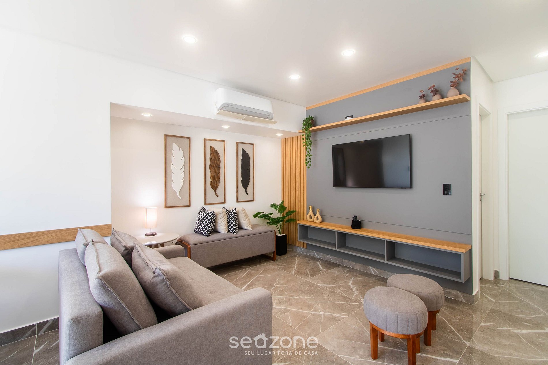 - Sala de estar con sofá cama doble, Smart TV, ventilador portátil y aire acondicionado;