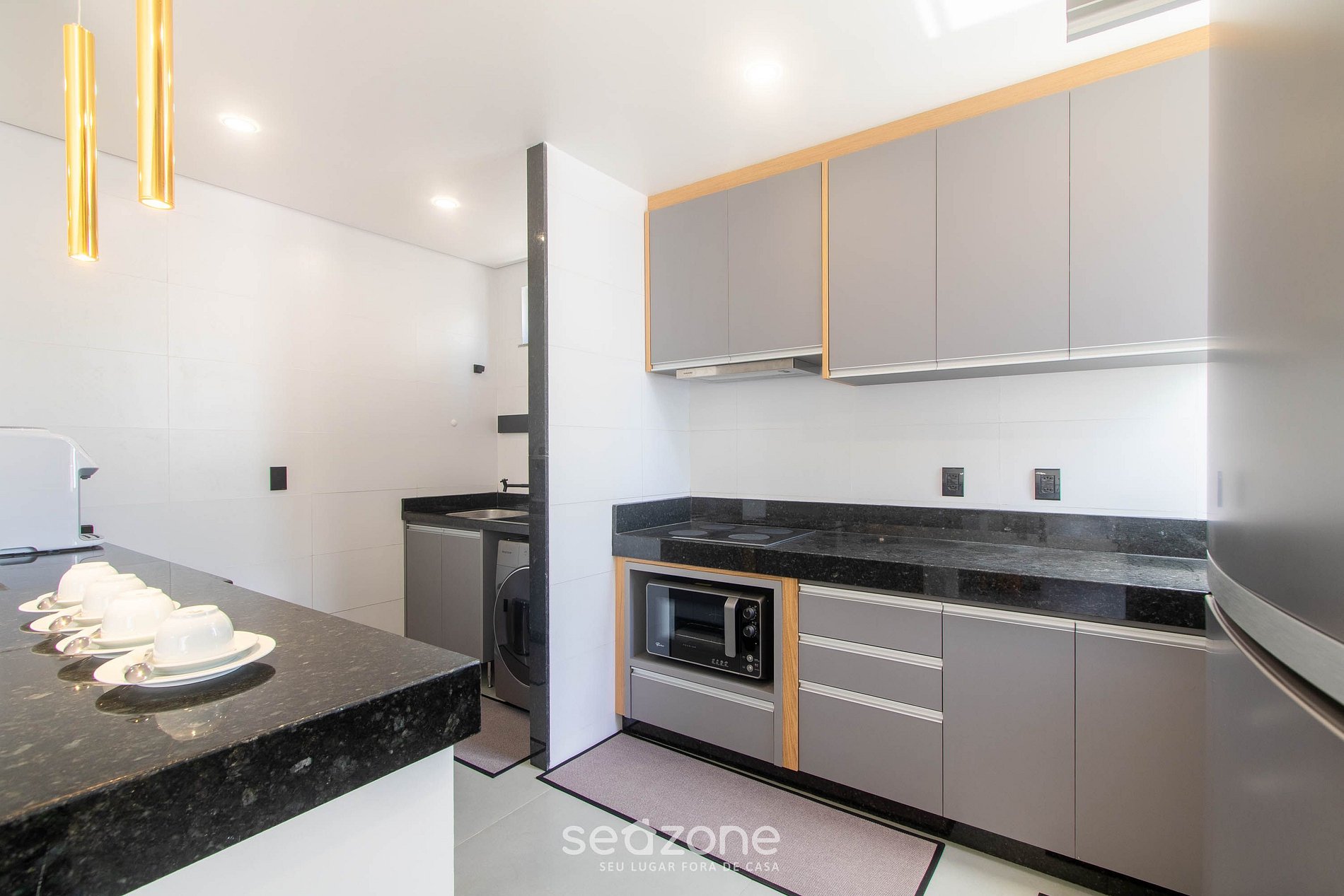 - Cocina completa con nevera, placa de inducción, horno eléctrico, microondas, freidora de aire, sandwichera, cafetera eléctrica, kit de café (soporte para filtro, termo), hervidor, licuadora, copas de vino, ollas, platos y utensilios;