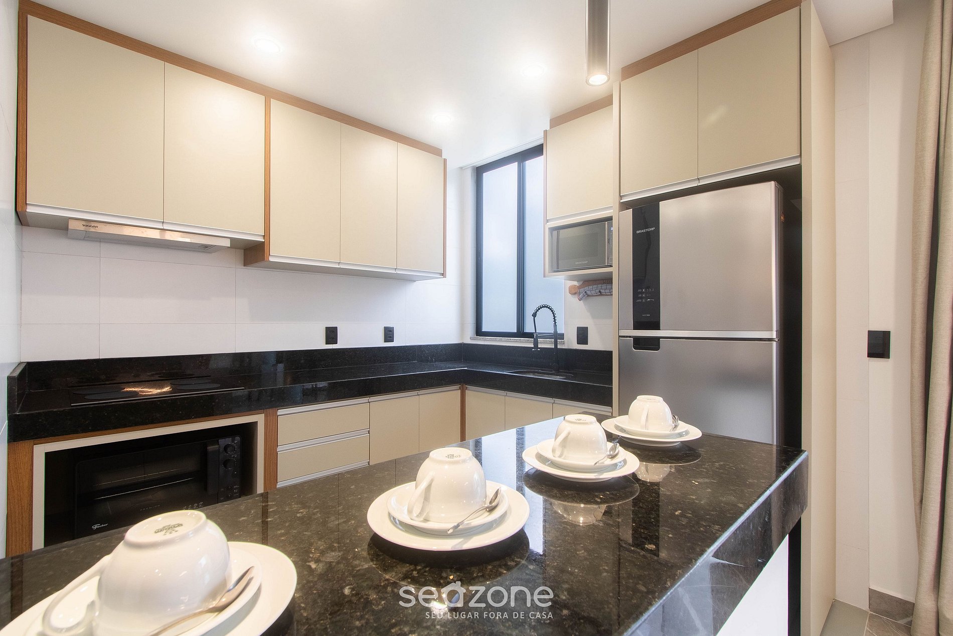 - Cocina completa con refrigerador, estufa (inducción), horno eléctrico, microondas, freidora de aire, sandwichera, cafetera eléctrica, tetera, licuadora, copas de vino, ollas, platos y utensilios;