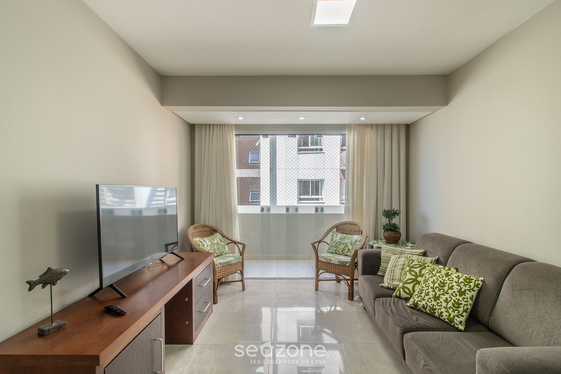 - Sala de estar con sofá, Smart TV y aire acondicionado.