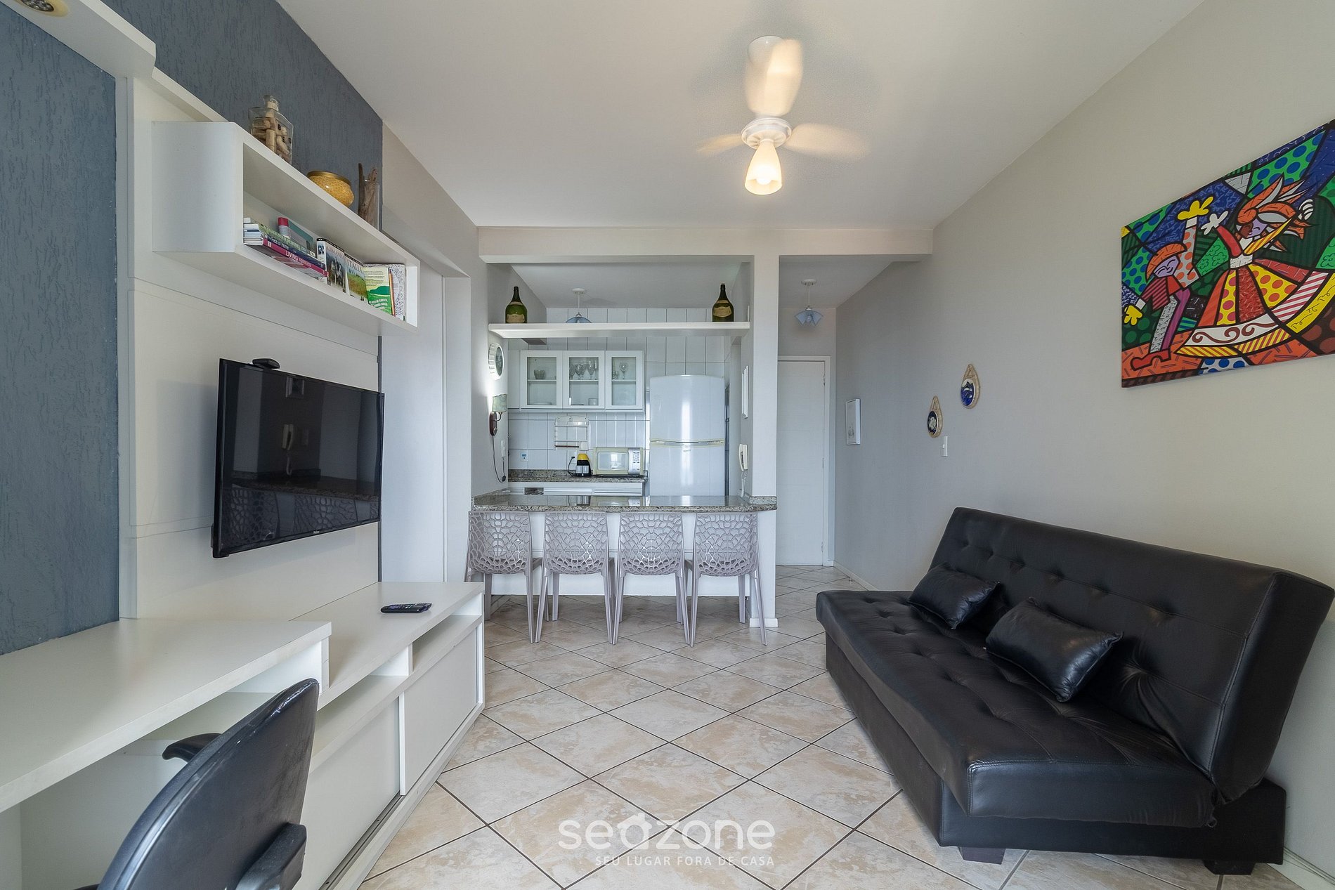 - Sala de estar con sofá cama matrimonial, Smart TV y ventilador de techo;