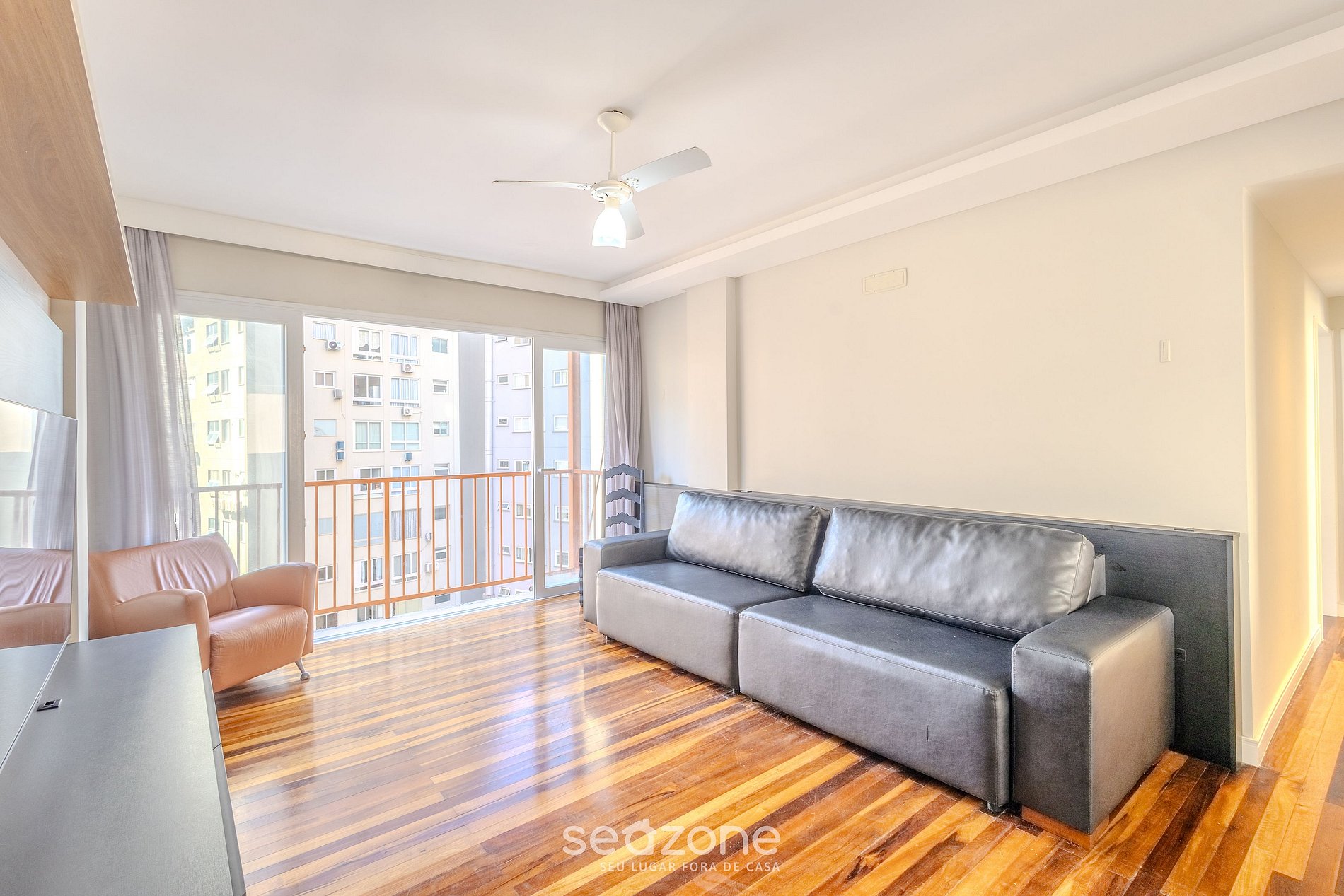 - Sala de estar con sofá, ventilador de techo y Smart TV;
