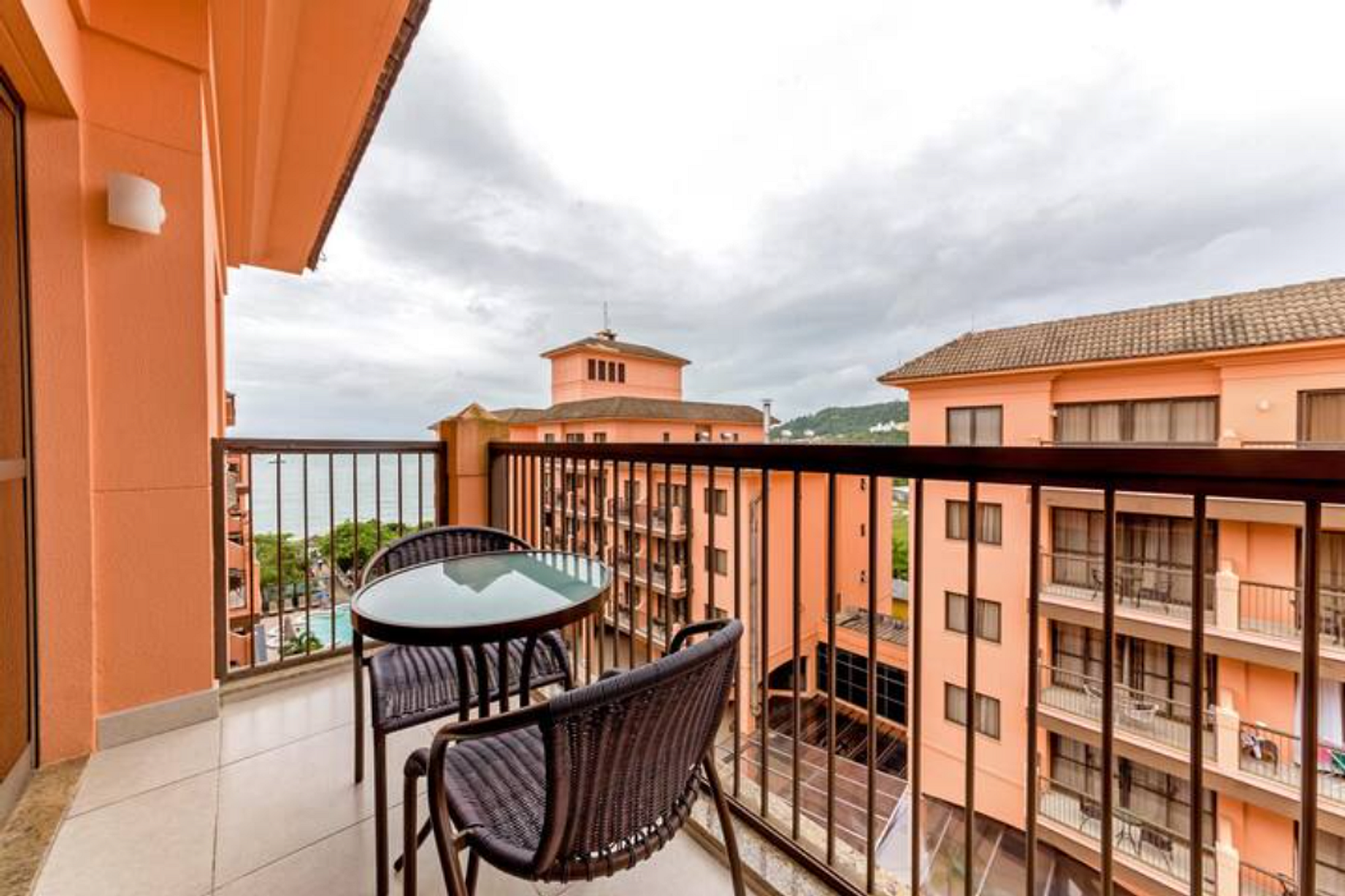 Desde el balcón con vista al mar y frente a la piscina, puede disfrutar de la vista de un atardecer o despertarse y ver si el día es para la playa o una piscina climatizada.