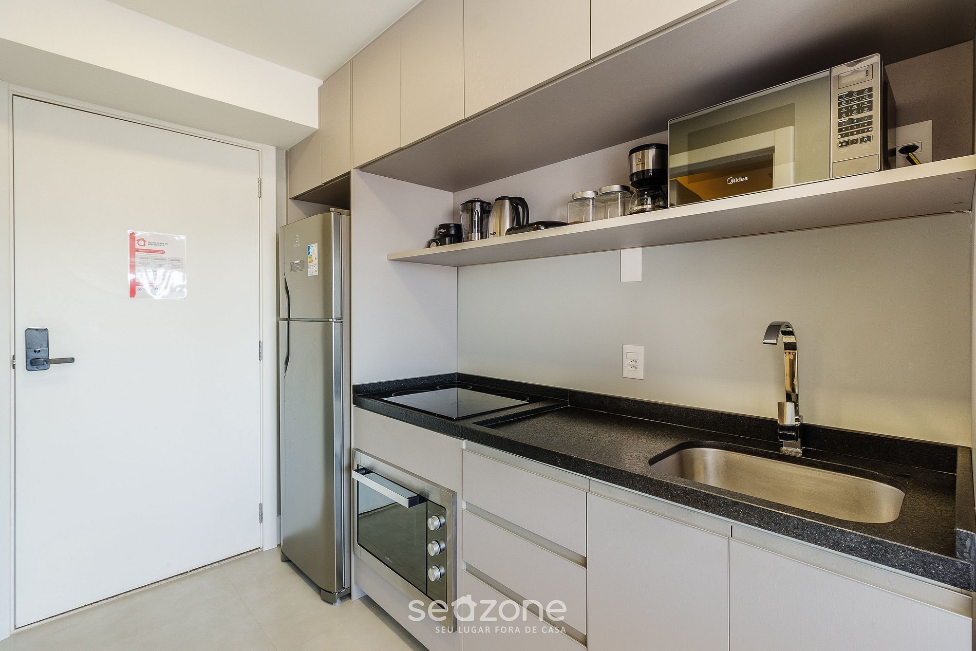 - Cocina compacta con frigorífico, cooktop, horno, microondas, cafetera y demás utensilios;