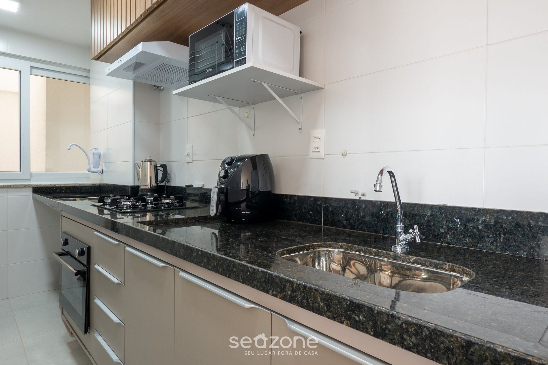 - Cocina totalmente equipada con refrigerador, cocina a gas, horno eléctrico, airfryer, microondas, sandwichera, cafetera eléctrica, hervidor eléctrico, licuadora, sartenes, vajilla y utensilios;