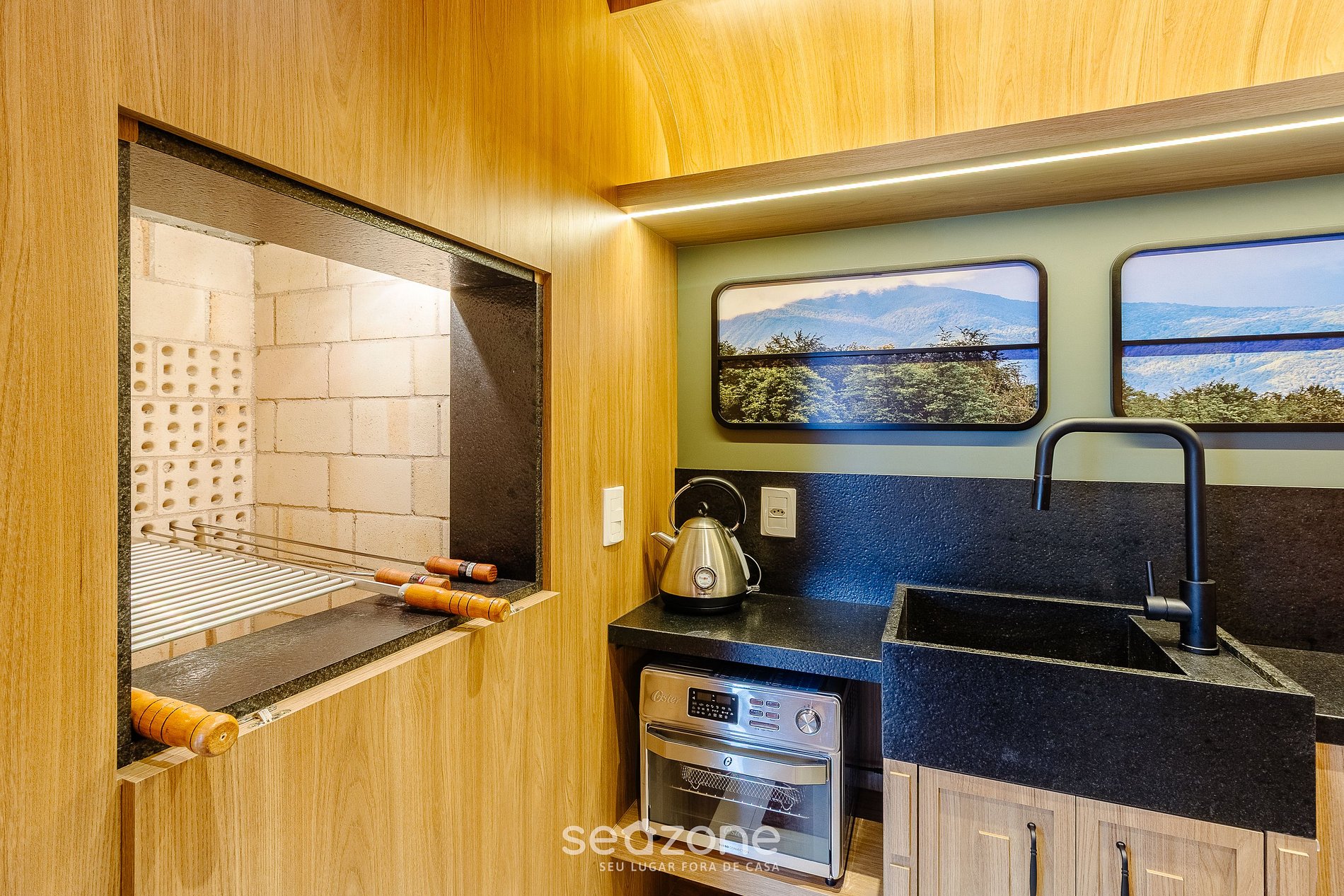 - Cocina totalmente equipada con refrigerador, anafe (gas), airfryer, barbacoa, microondas, sandwichera, cafetera eléctrica, pava eléctrica, licuadora, copas de vino, sartenes, vajilla y utensilios;
