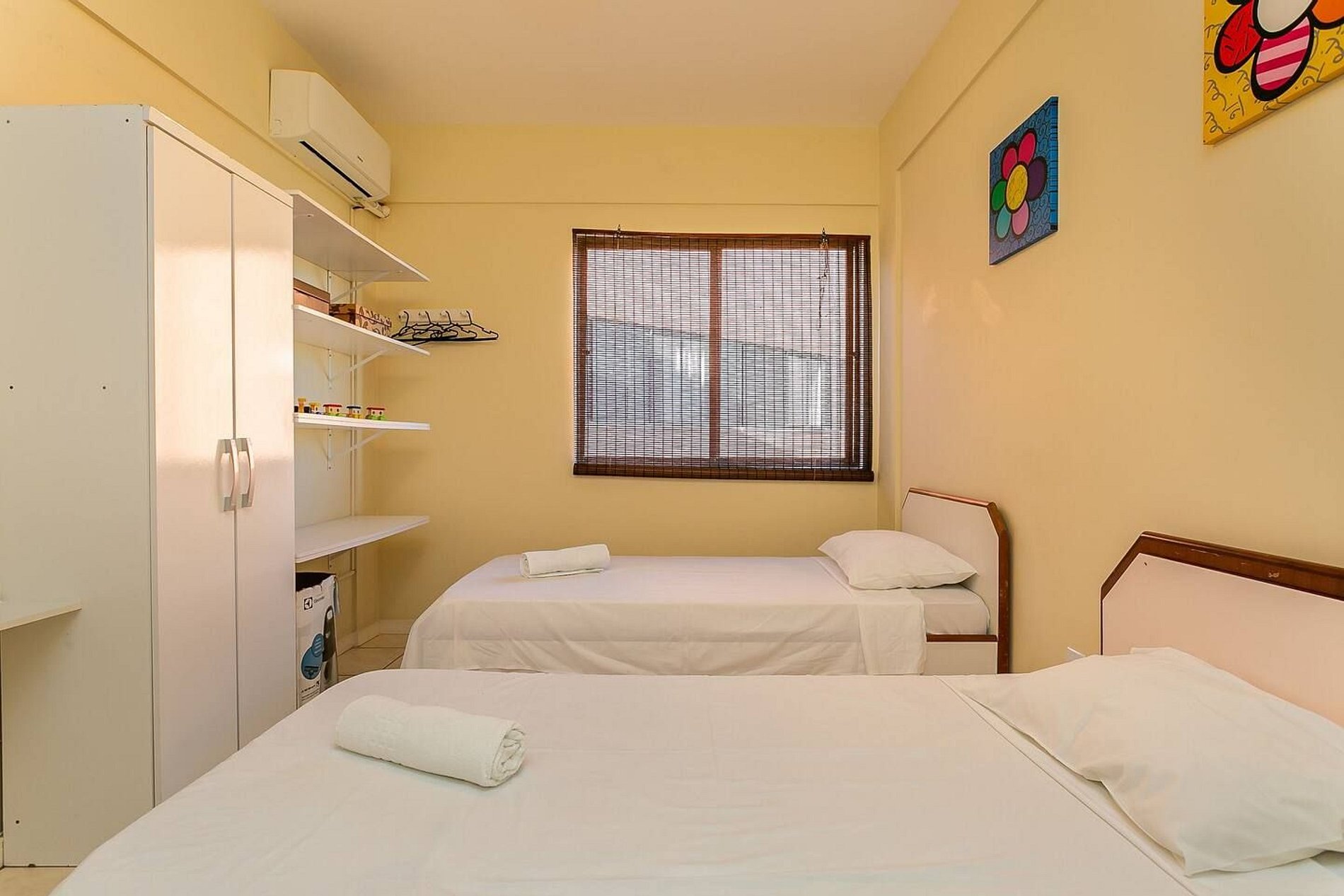 - 1 dormitorio con 2 camas individuales, armario, estanterías, TV y aire acondicionado;