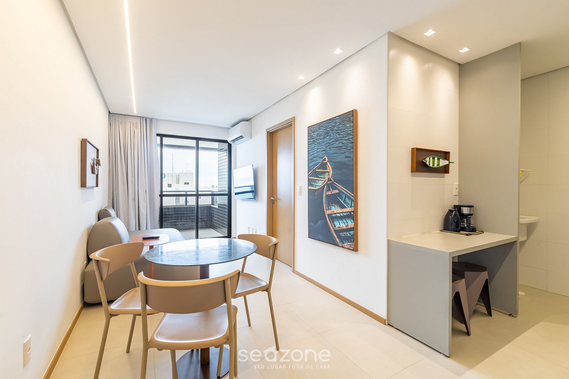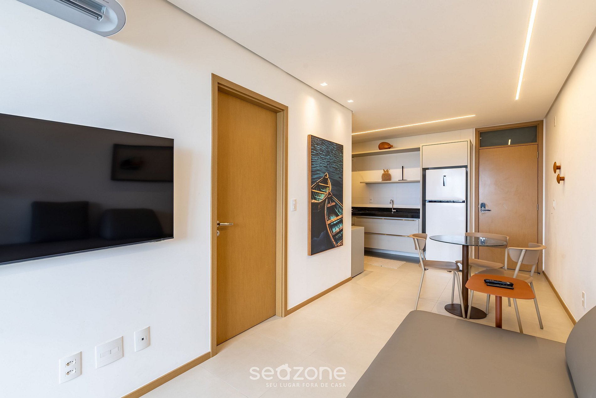 Cuenta con un dormitorio climatizado, sala con sofá cama y Smart TV, cocina completa, Wi-Fi y balcón con vista al mar. El edificio tiene piscina, gimnasio y más. Todo a pasos de los mejores restaurantes y mercados de Maceió.