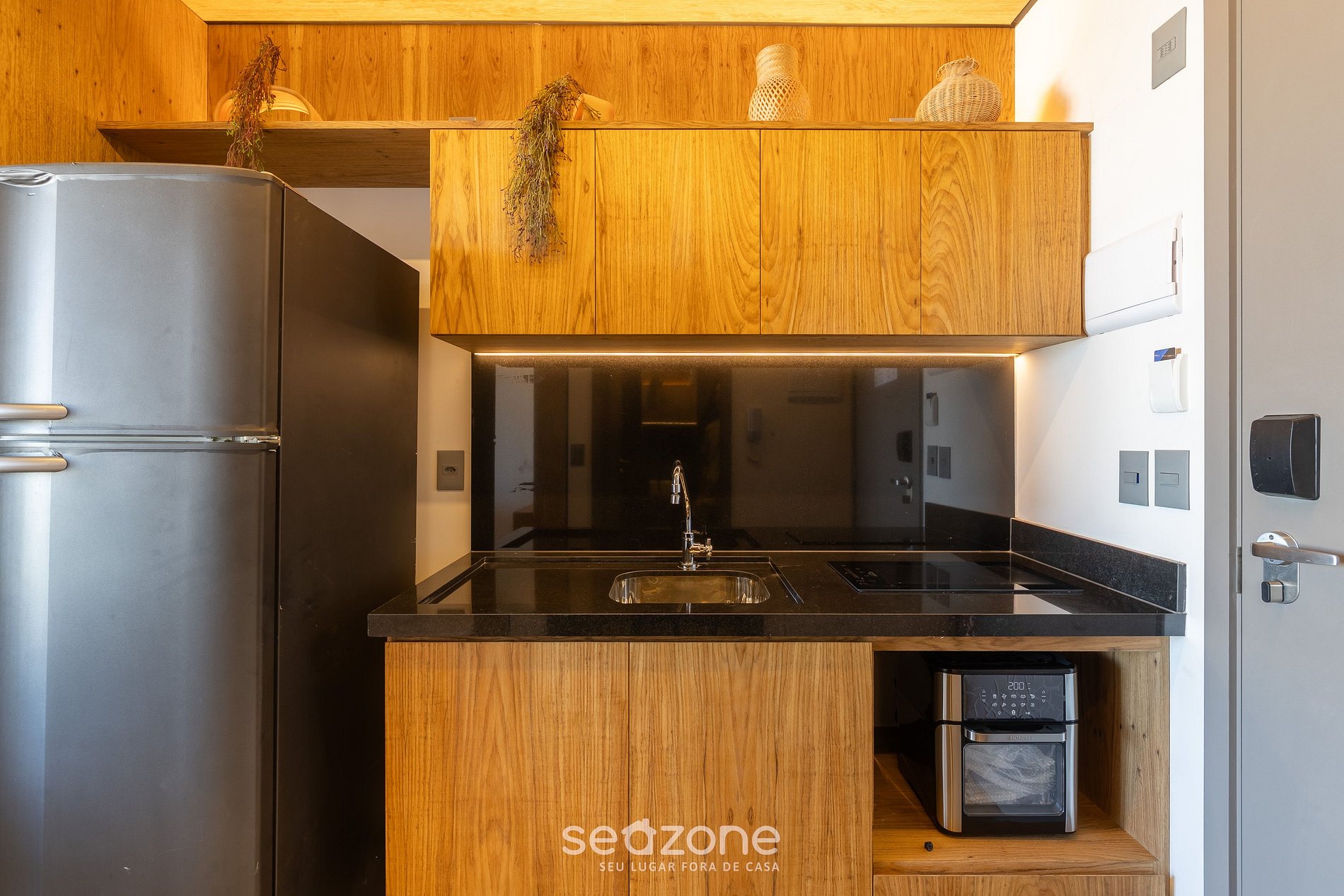 - Cocina con refrigerador, estufa de inducción, airfryer, sandwichera, kit de café (portafiltro, termo), licuadora, copas de vino, sartenes, vajilla y utensilios;