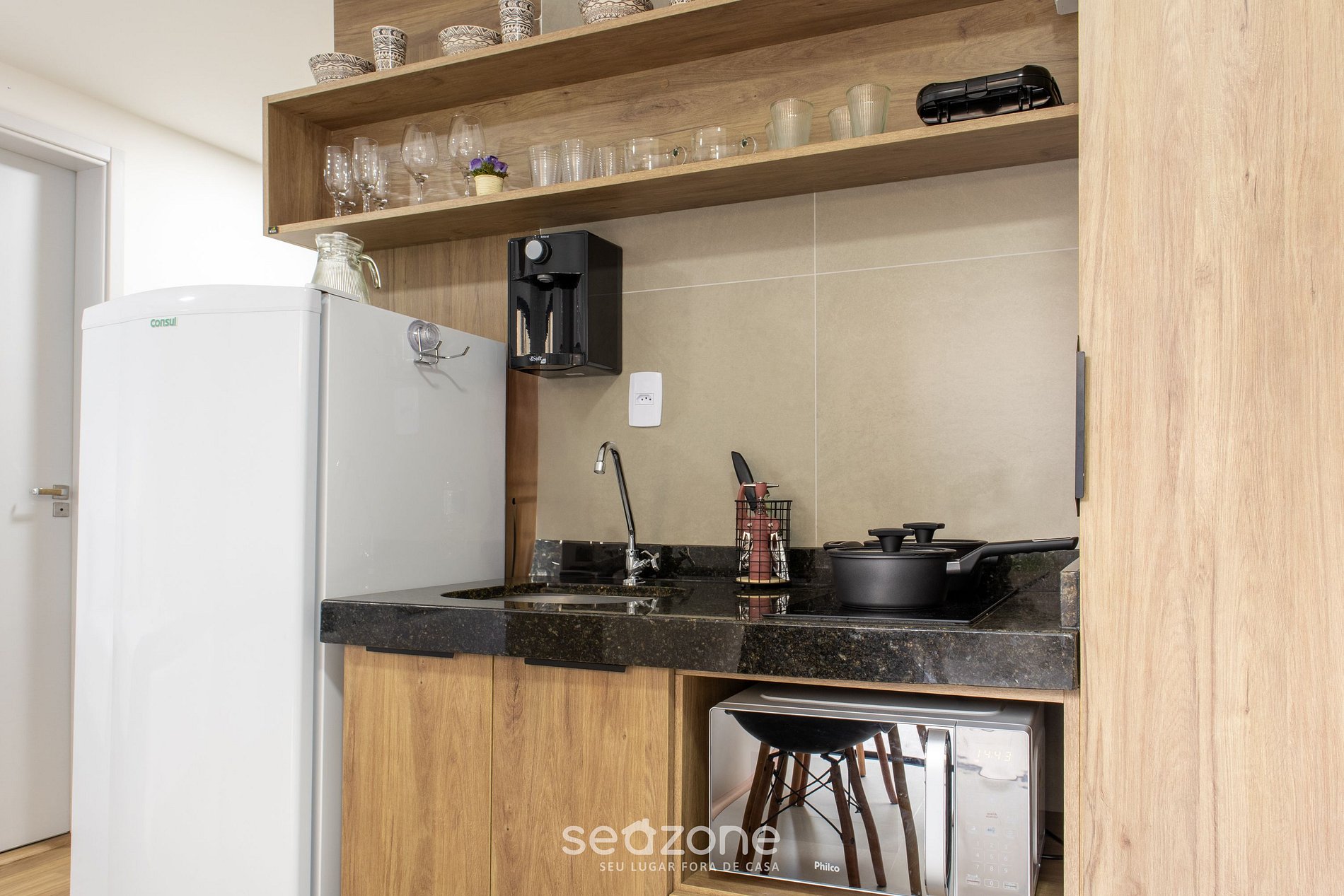 - Cocina completa con refrigerador, cocina de inducción, microondas, sandwichera, cafetera eléctrica, hervidor eléctrico, licuadora, copas de vino, ollas, vajilla y utensilios;