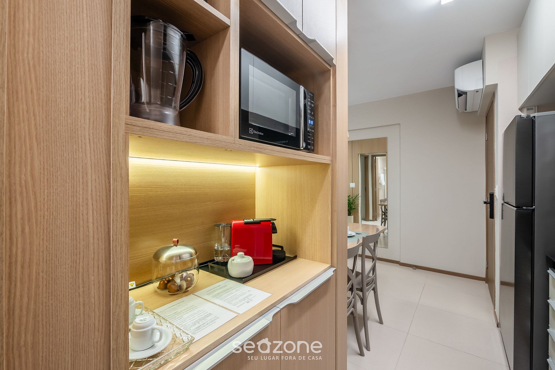 - Cocina completa con refrigerador, placa de inducción, horno eléctrico, microondas, sandwichera, cafetera Nespresso, hervidor (lechera), licuadora, copas de vino, ollas, platos y utensilios;