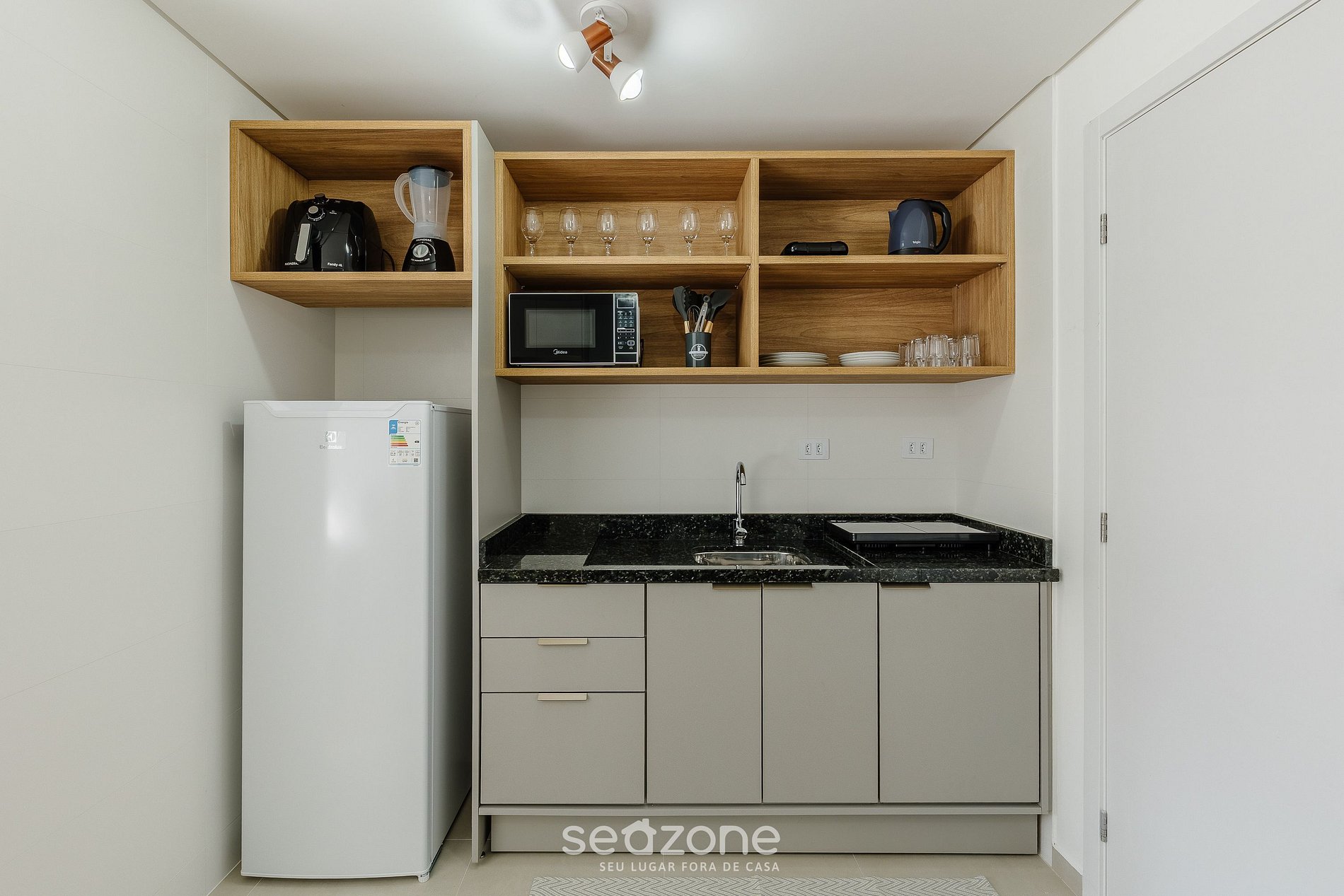 - Cocina completa con refrigerador, placa de inducción, freidora de aire, microondas, sandwichera, cafetera eléctrica, hervidor eléctrico, licuadora, copas de vino, ollas, platos y utensilios;