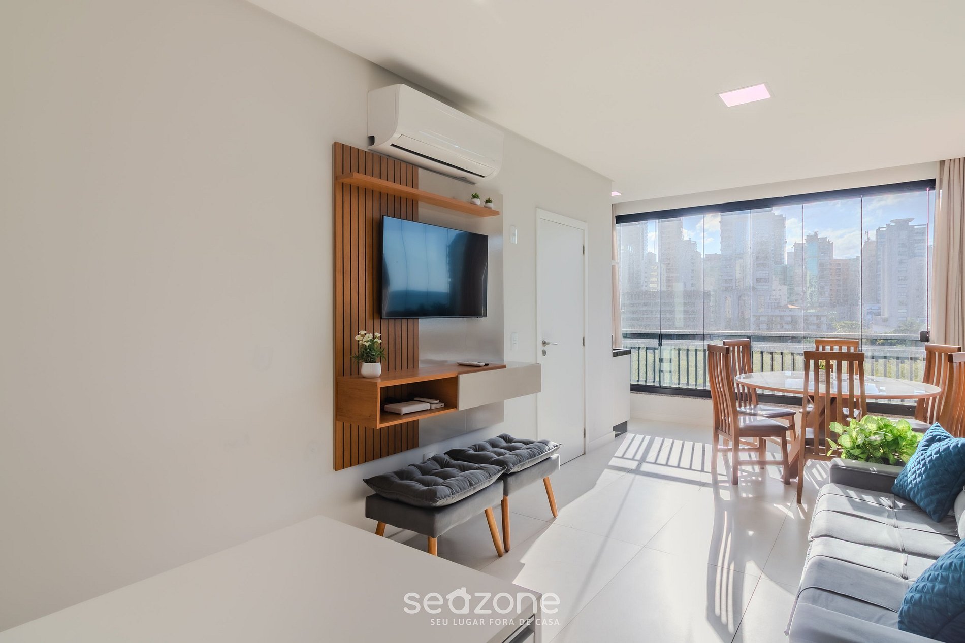 - Sala de estar con sofá, Smart TV y aire acondicionado;