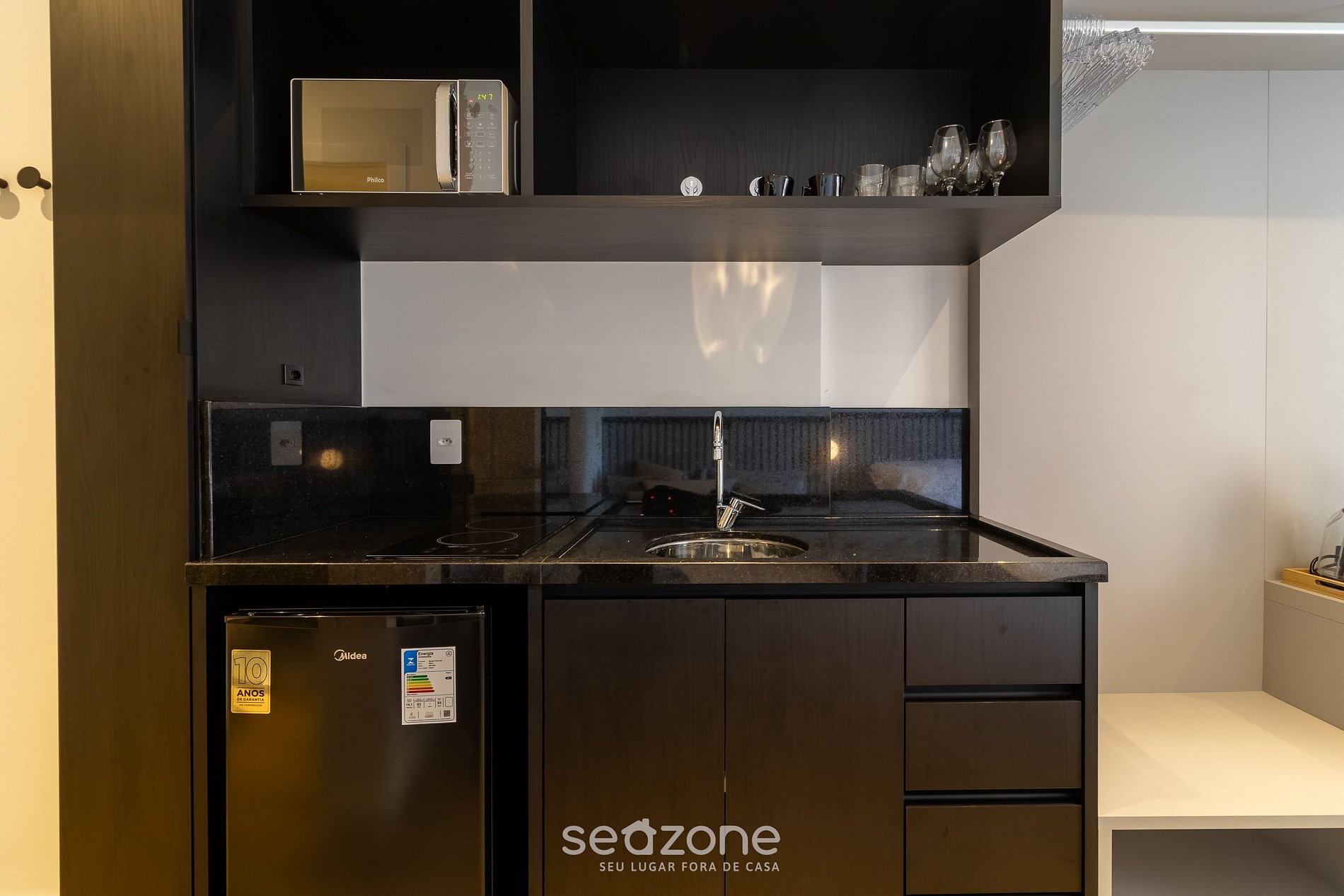 - Cocina completa con minibar, cocina cooktop (eléctrica), microondas, sandwichera, cafetera eléctrica (cápsula), tetera eléctrica, licuadora, copas de vino, ollas, vajilla y utensilios;