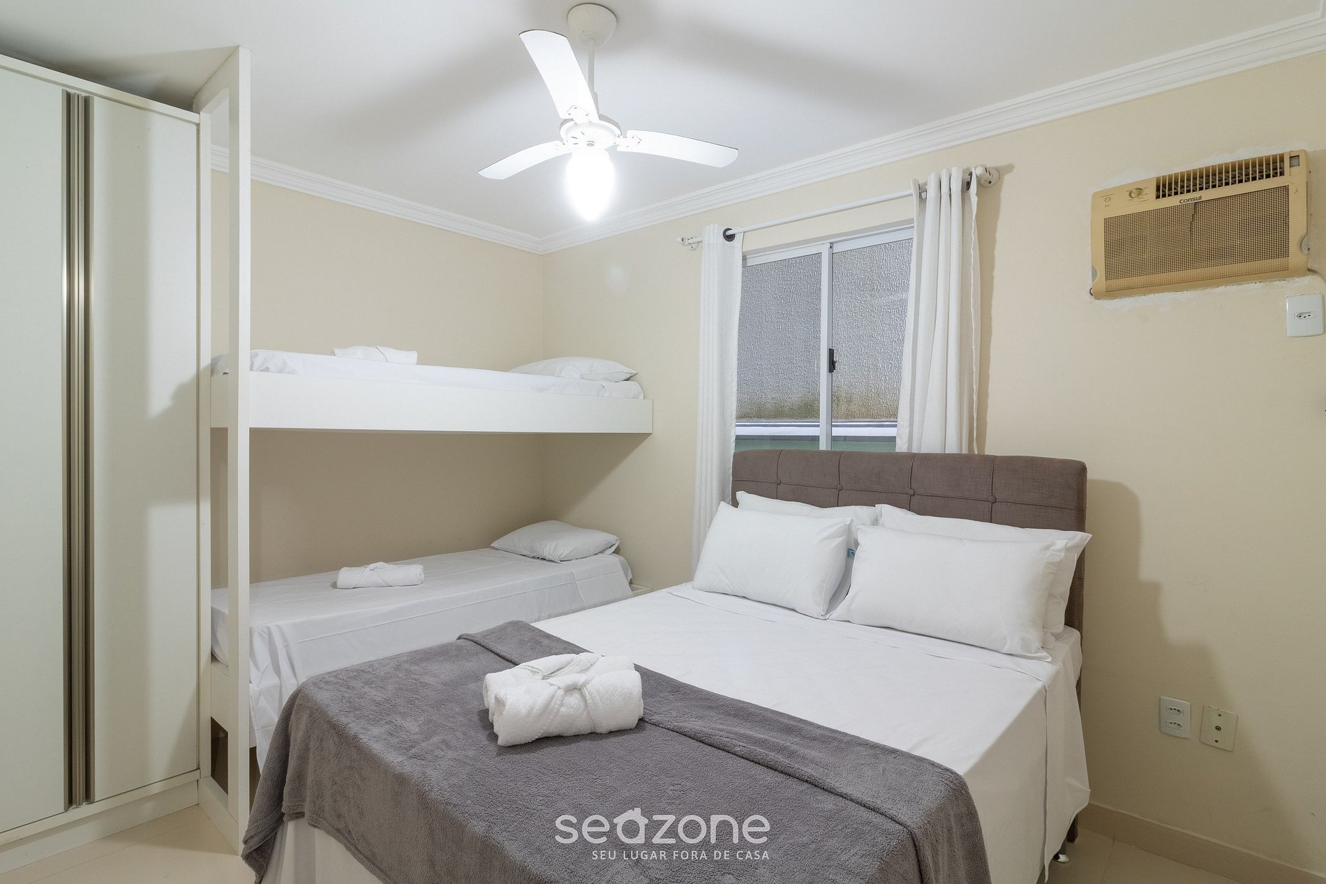 - 1 dormitorio con cama matrimonial, litera con 2 camas individuales, armario y aire acondicionado;