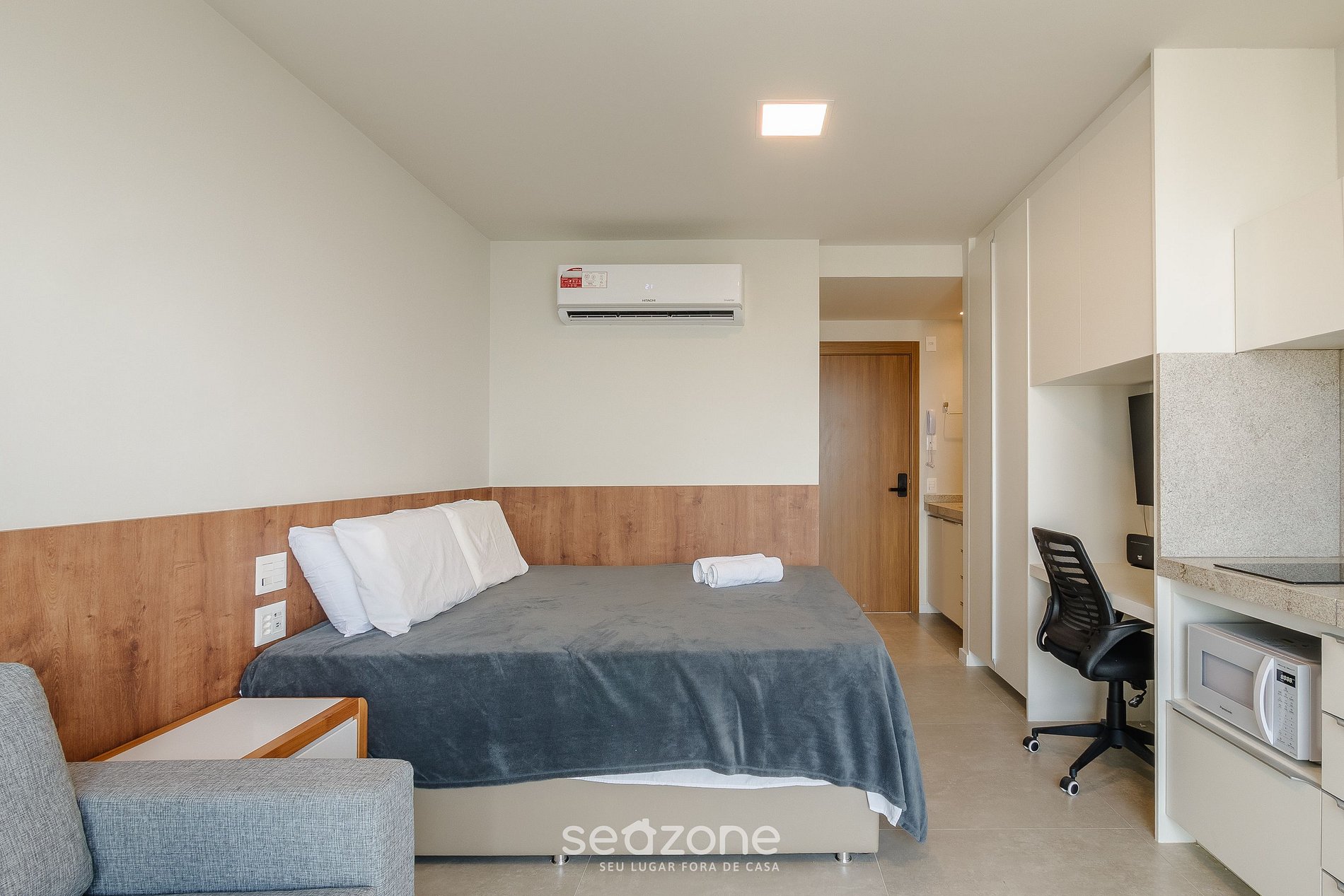 Total confort con cama queen, aire acondicionado, sofá, Smart TV y cocina equipada. Disfruta de la ubicación estratégica, cerca de la playa y con fácil acceso a restaurantes y mercados. Aprovecha las áreas comunes con piscina en la azotea, gimnasio y espacio para coworking.