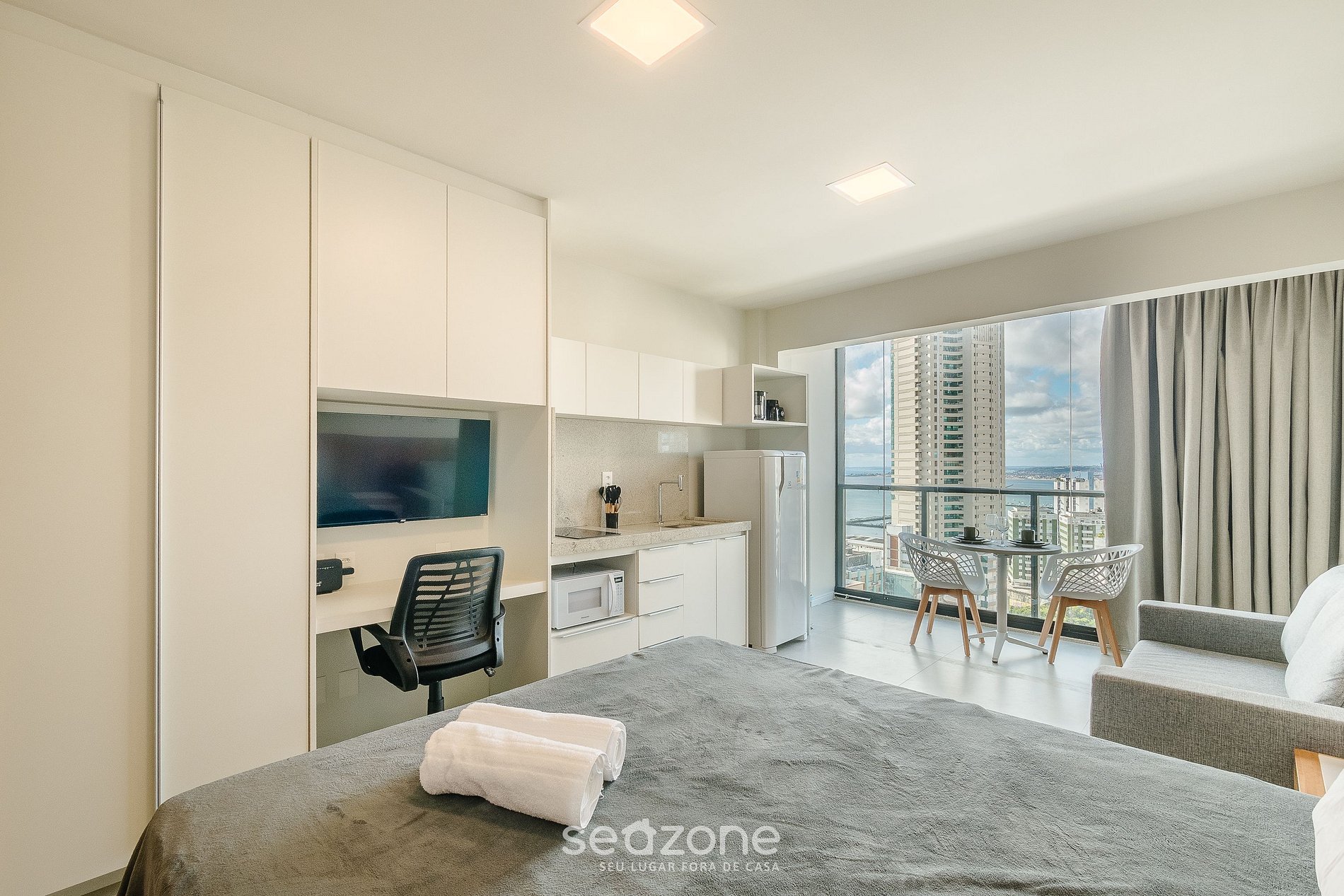 Studio moderno con vista panorámica al mar y a la ciudad de Salvador.