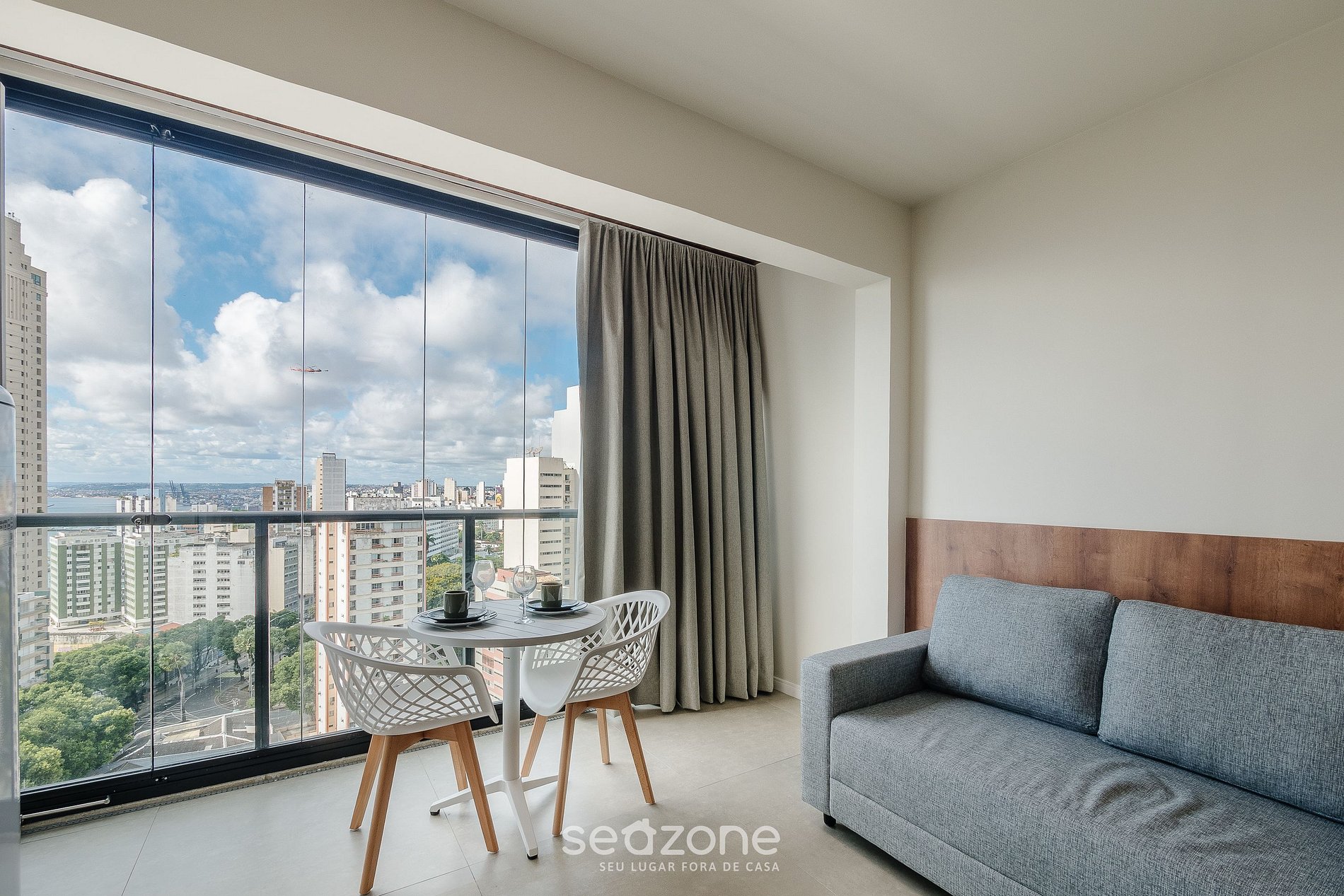Studio moderno con vista panorámica al mar y a la ciudad de Salvador.