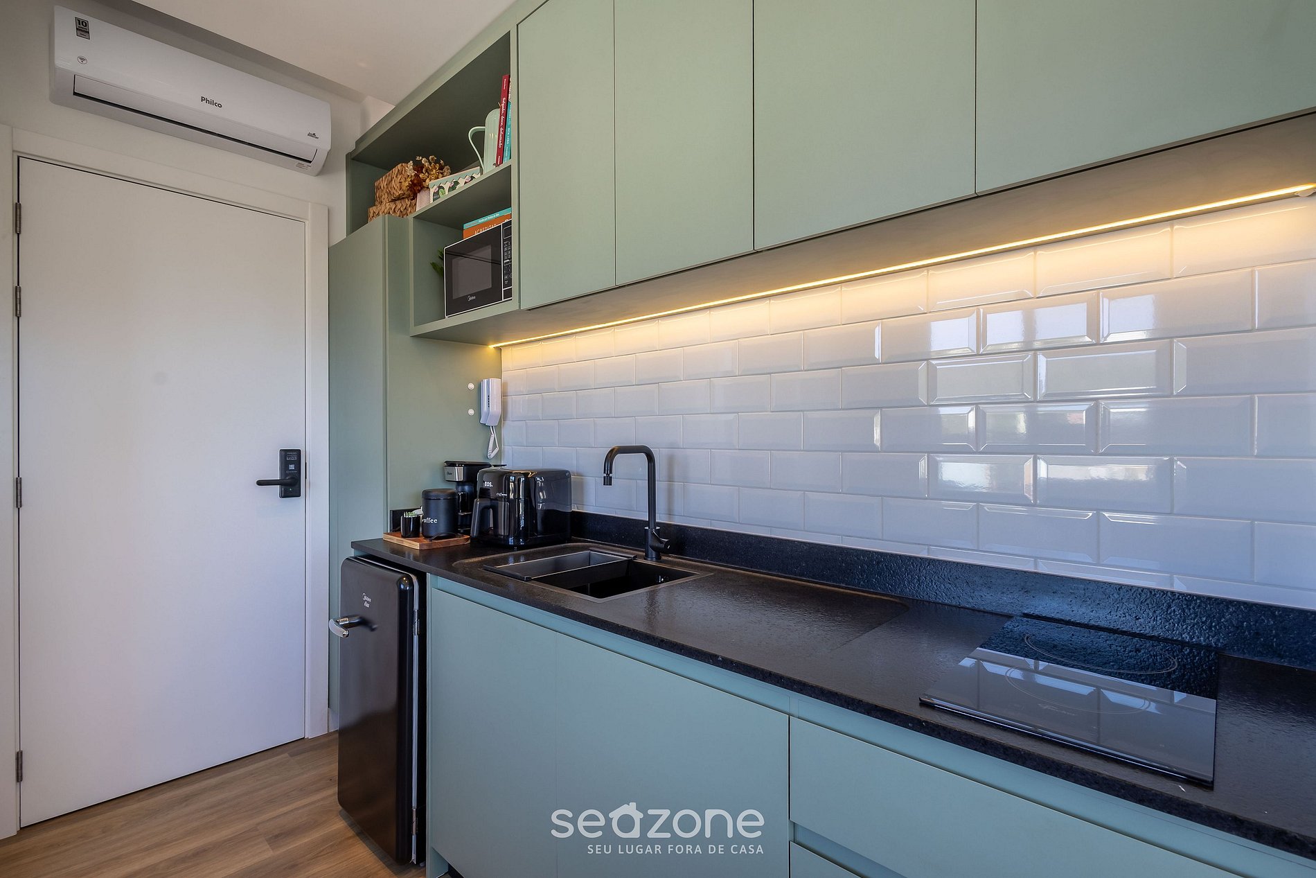 - Cocina totalmente equipada con buenos utensilios para preparar una excelente comida, incluyendo minibar, estufa de inducción, freidora de aire, microondas, sandwichera, cafetera eléctrica, hervidor eléctrico, licuadora, copas de vino, ollas, vajilla y utensilios;