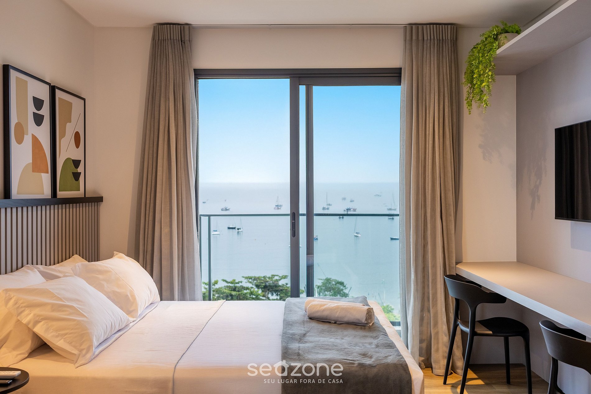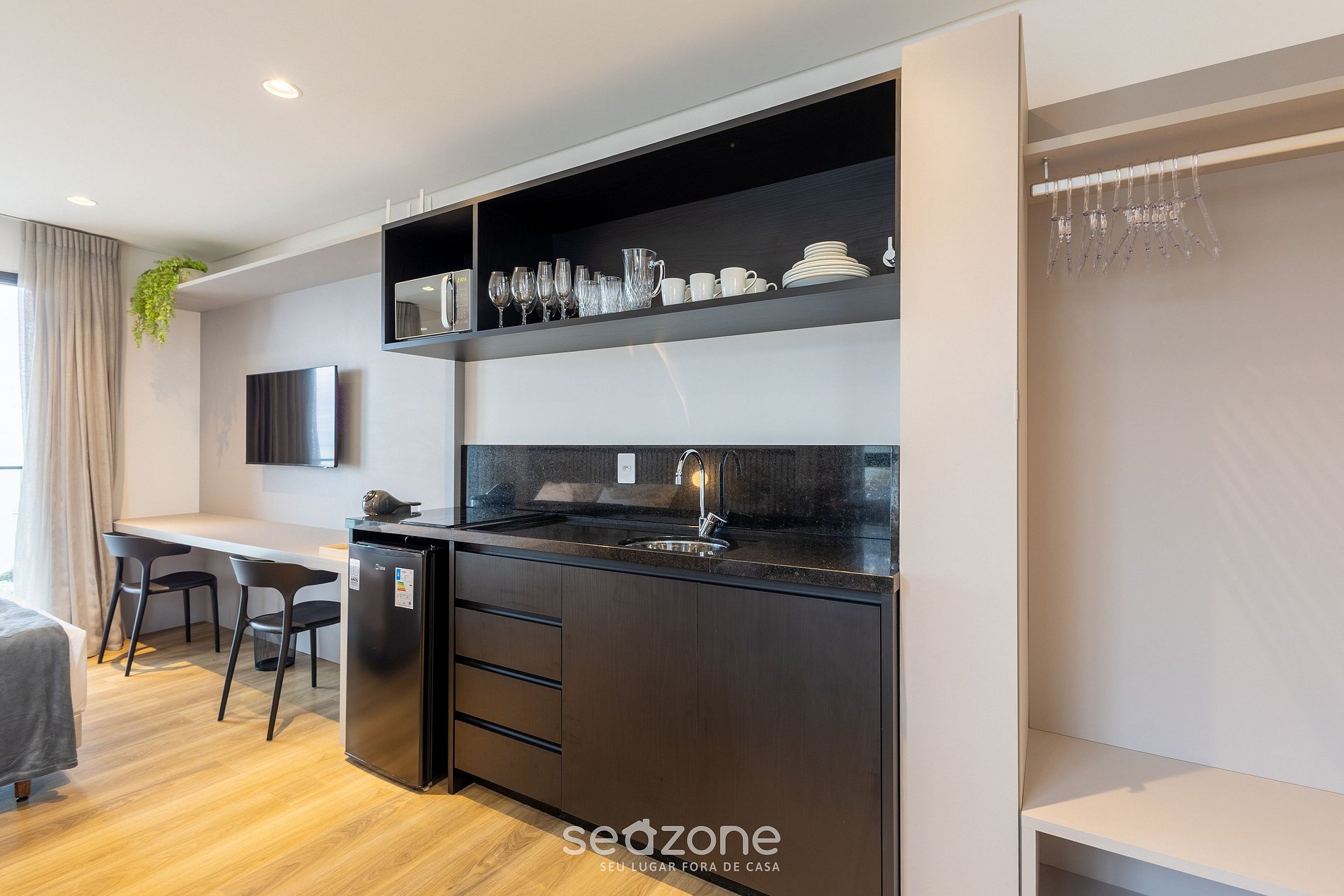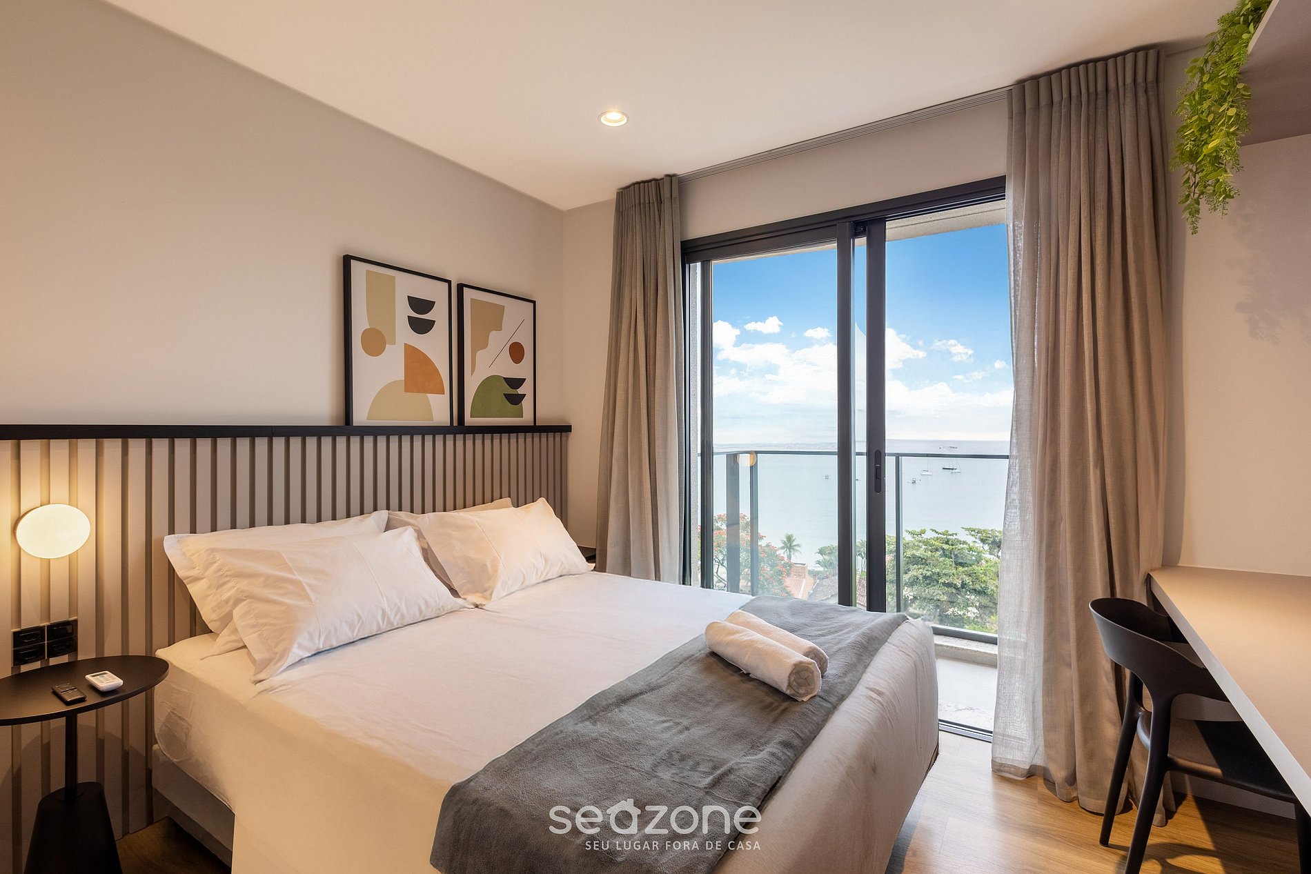 Este moderno y bien decorado studio, con aire acondicionado, cuenta con cama queen, sofá-cama, cocina completa y una terraza con vista al mar, haciendo su estadía perfecta. Disfrute de la piscina del condominio en el rooftop. A solo 50 metros de la playa y a pocos minutos de Beto Carrero, la ubicación es excelente.