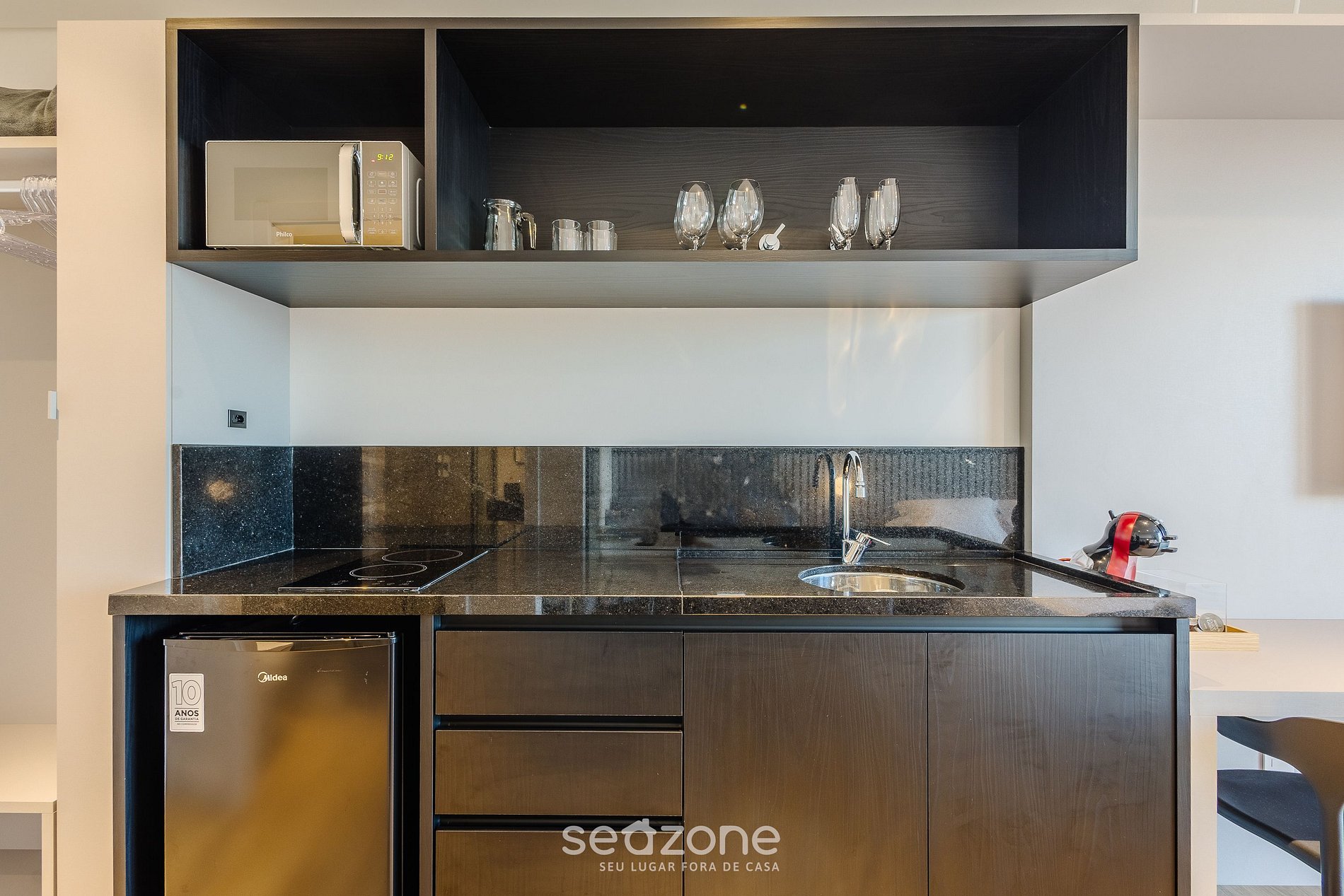 - Cocina completa con minibar, estufa de inducción, microondas, sandwichera, cafetera eléctrica, hervidor eléctrico, licuadora, copas de vino, ollas, platos y utensilios;