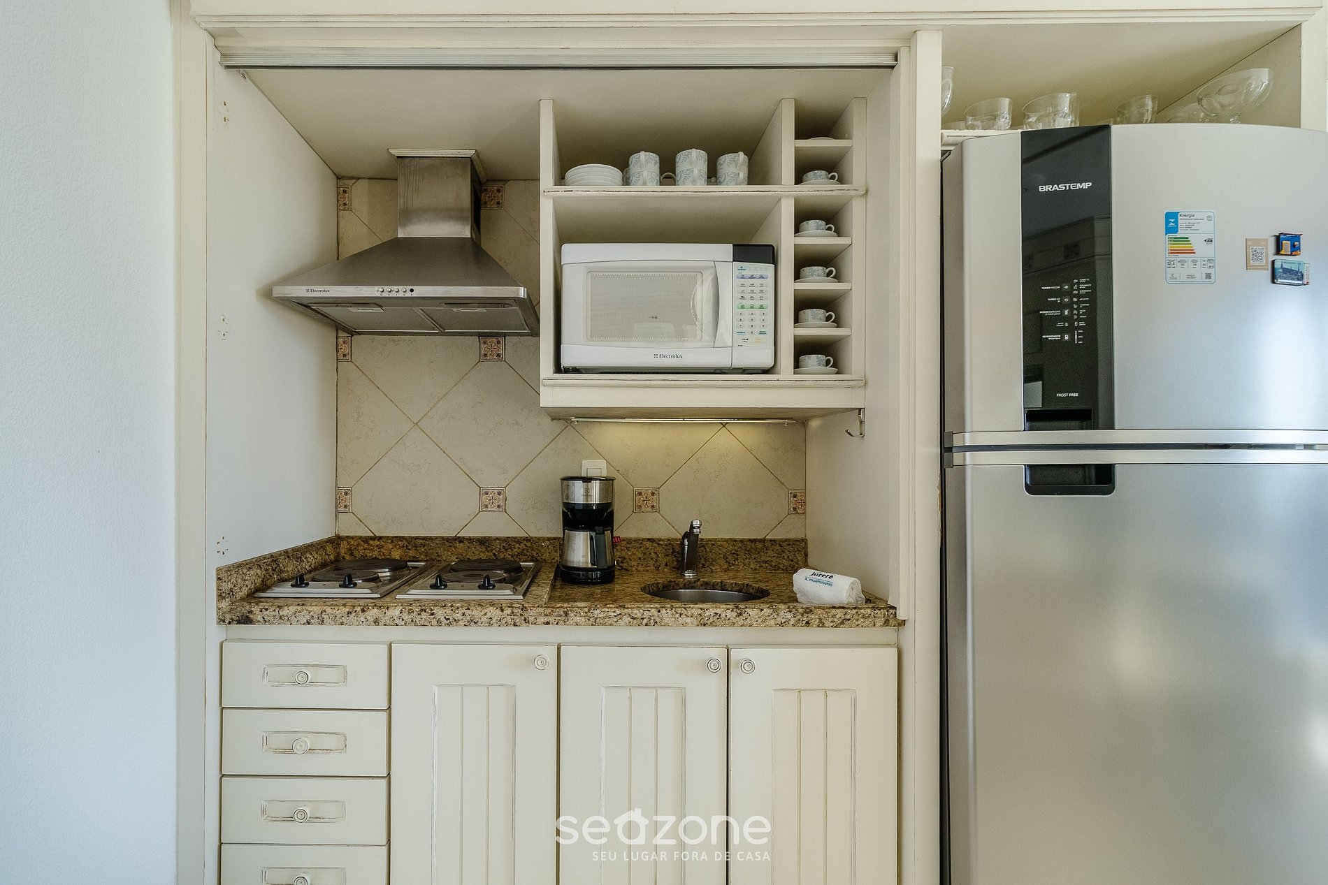 - Cocina completa con refrigerador, cocina eléctrica de 4 hornallas, microondas, cafetera eléctrica, copas de vino y utensilios de cocina;