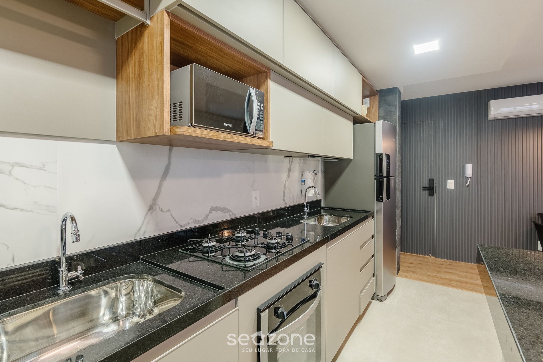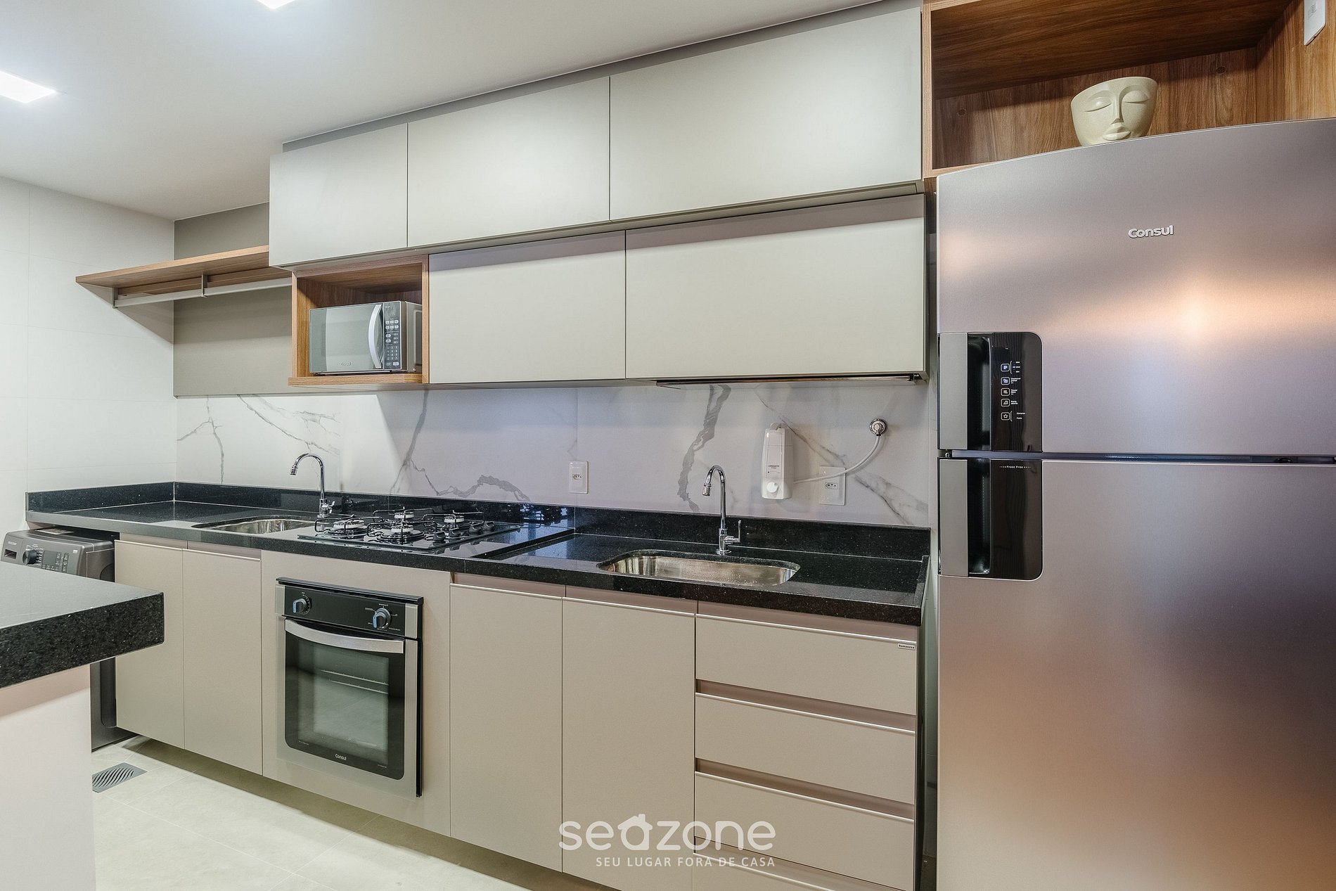 - Cocina totalmente equipada con refrigerador, estufa de gas, horno eléctrico, microondas, cafetera eléctrica, hervidor de agua (lechera), copas de vino, ollas, platos y utensilios;