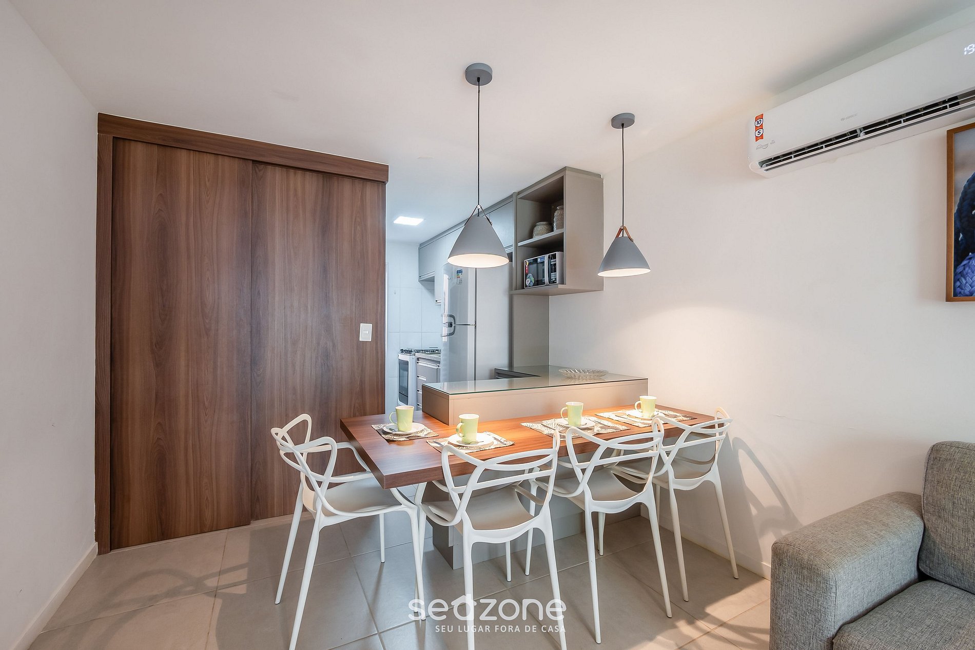 - Sala de estar con sofá, Smart TV y aire acondicionado;
