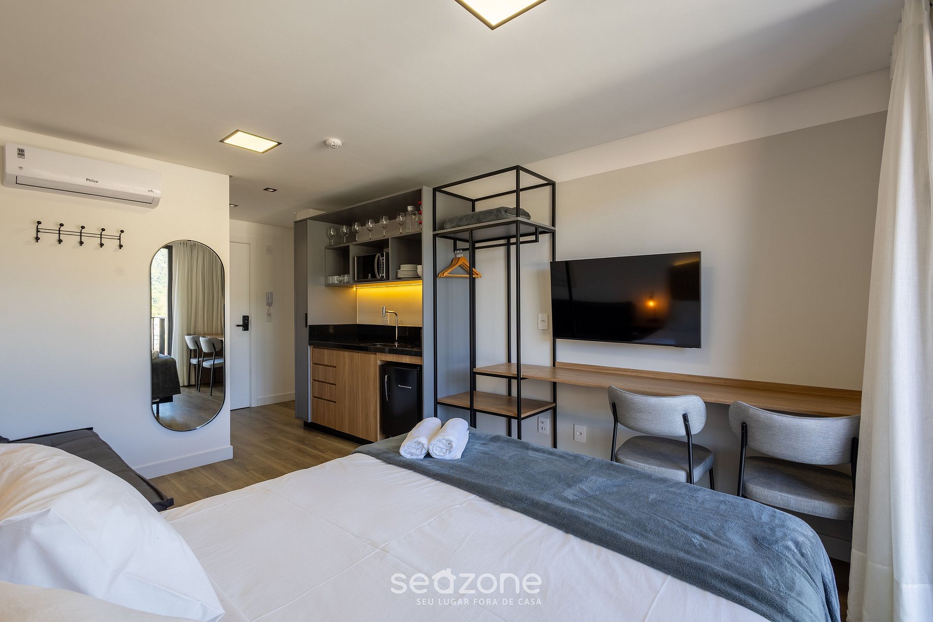 Este moderno estudio frente al mar ofrece todo lo que necesitas para una estancia cómoda y elegante: cama queen, sofá-cama, cocina completa, smart TV, aire acondicionado y una terraza con una vista deslumbrante al mar. Las áreas comunes incluyen un rooftop con piscina de borde infinito, además de la proximidad con Beto Carrero.