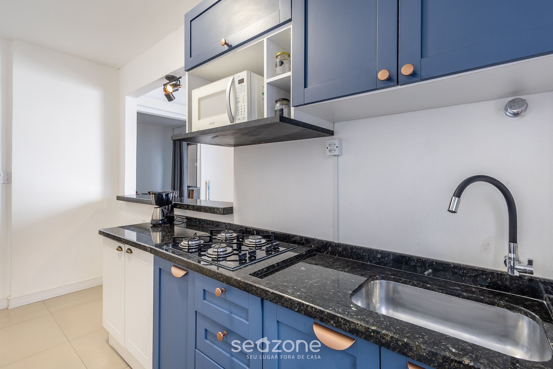 - Cocina completa con refrigerador, estufa de gas, microondas, sandwichera, cafetera eléctrica, hervidor eléctrico, licuadora, copas de vino, ollas, platos y utensilios;