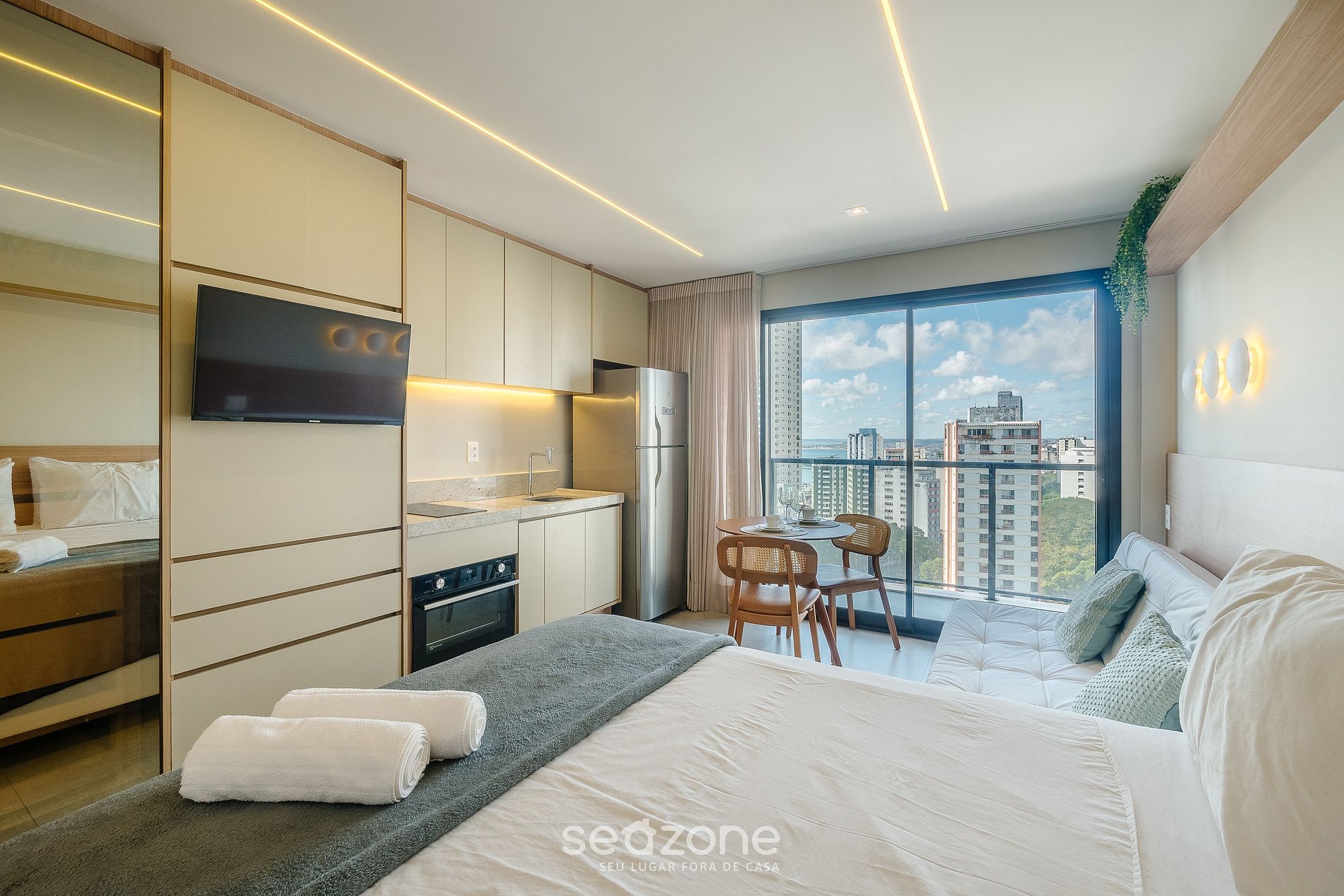 Vive la sofisticación y el confort de un estudio c/ una vista deslumbrante al mar y a la ciudad en Salvador.