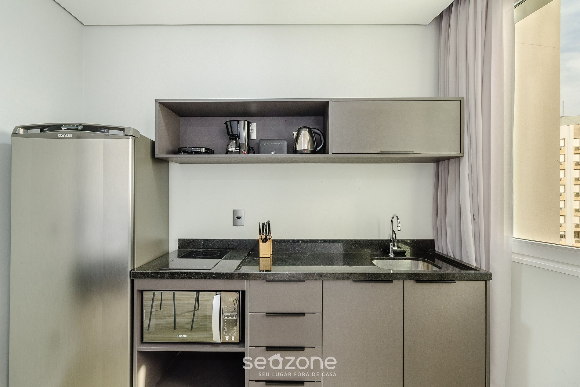 - Cocina completa con refrigerador, placa de inducción, microondas, sandwichera, cafetera, tetera, licuadora, copas de vino, ollas, platos y utensilios;