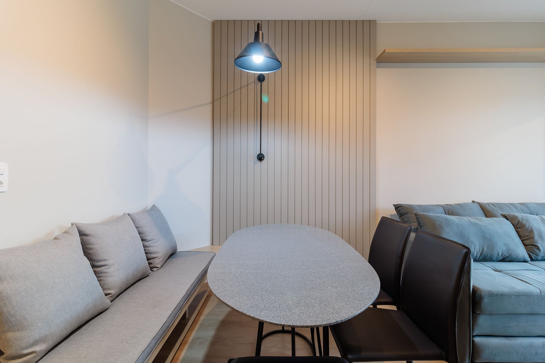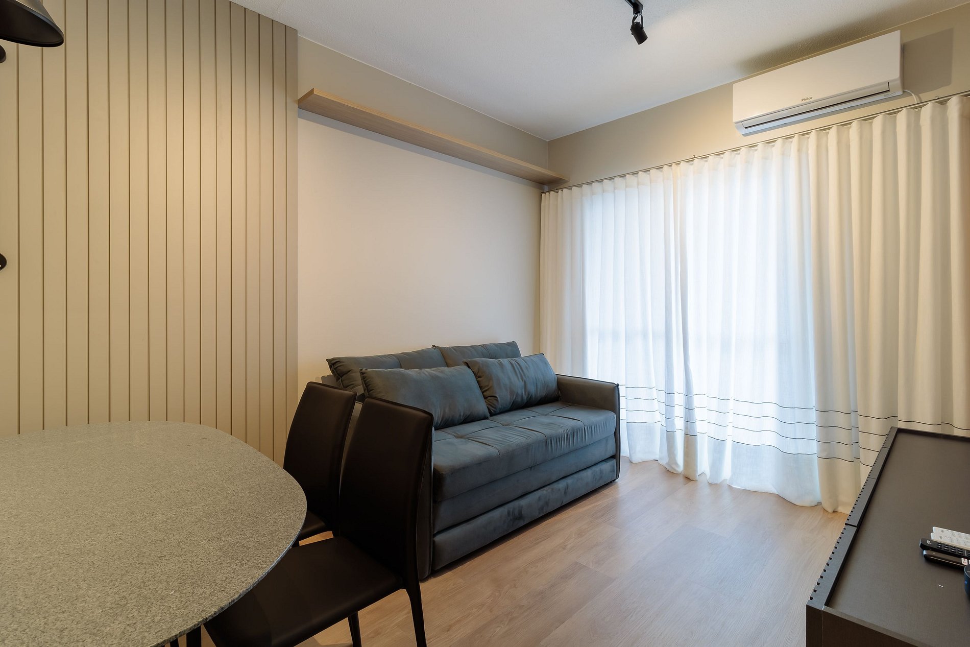 - Sala y comedor integrados con sofá cama, TV, aire acondicionado y mesa de comedor con sillas y banca;