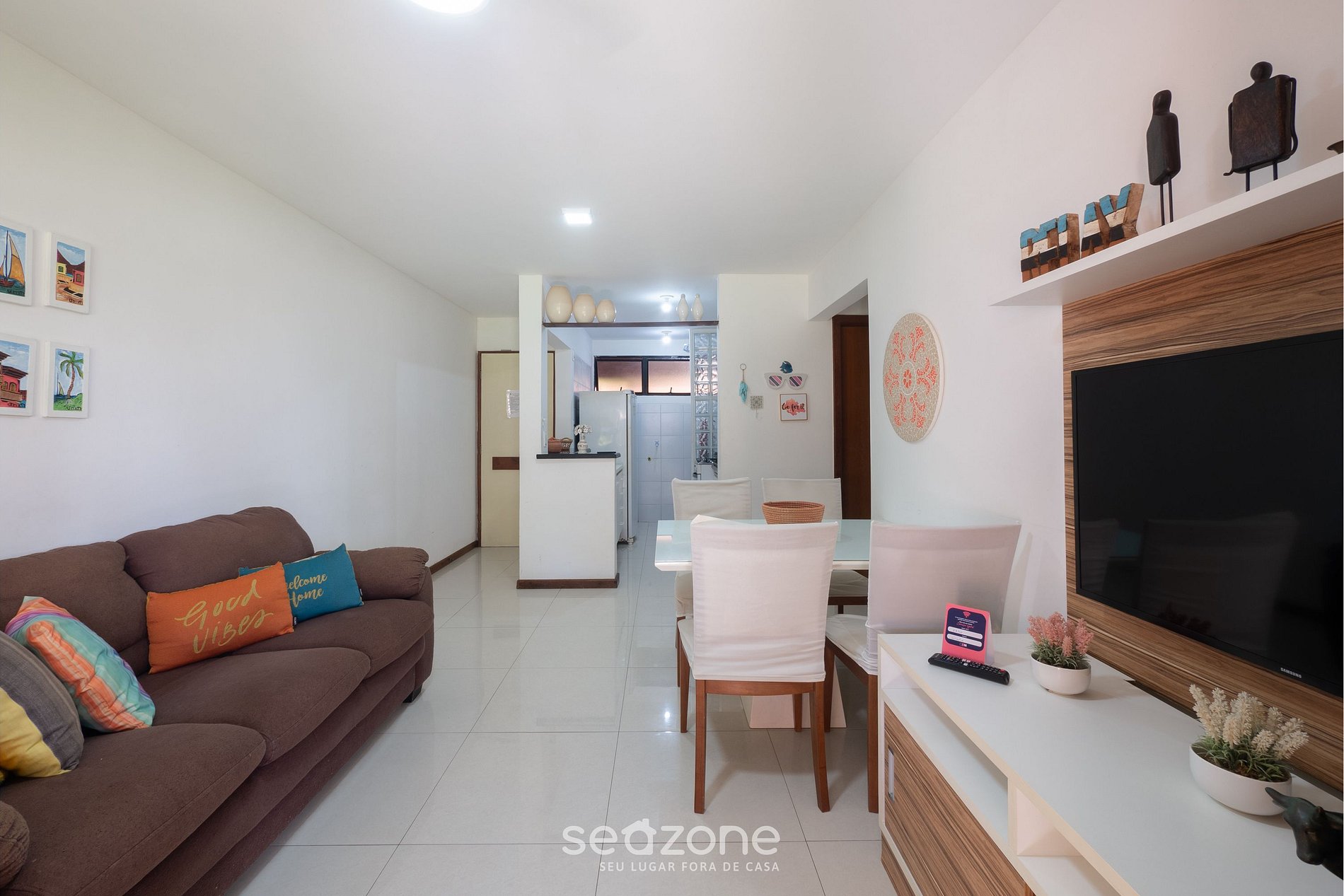 - Sala de estar con sofá, Smart TV y ventilador de techo;