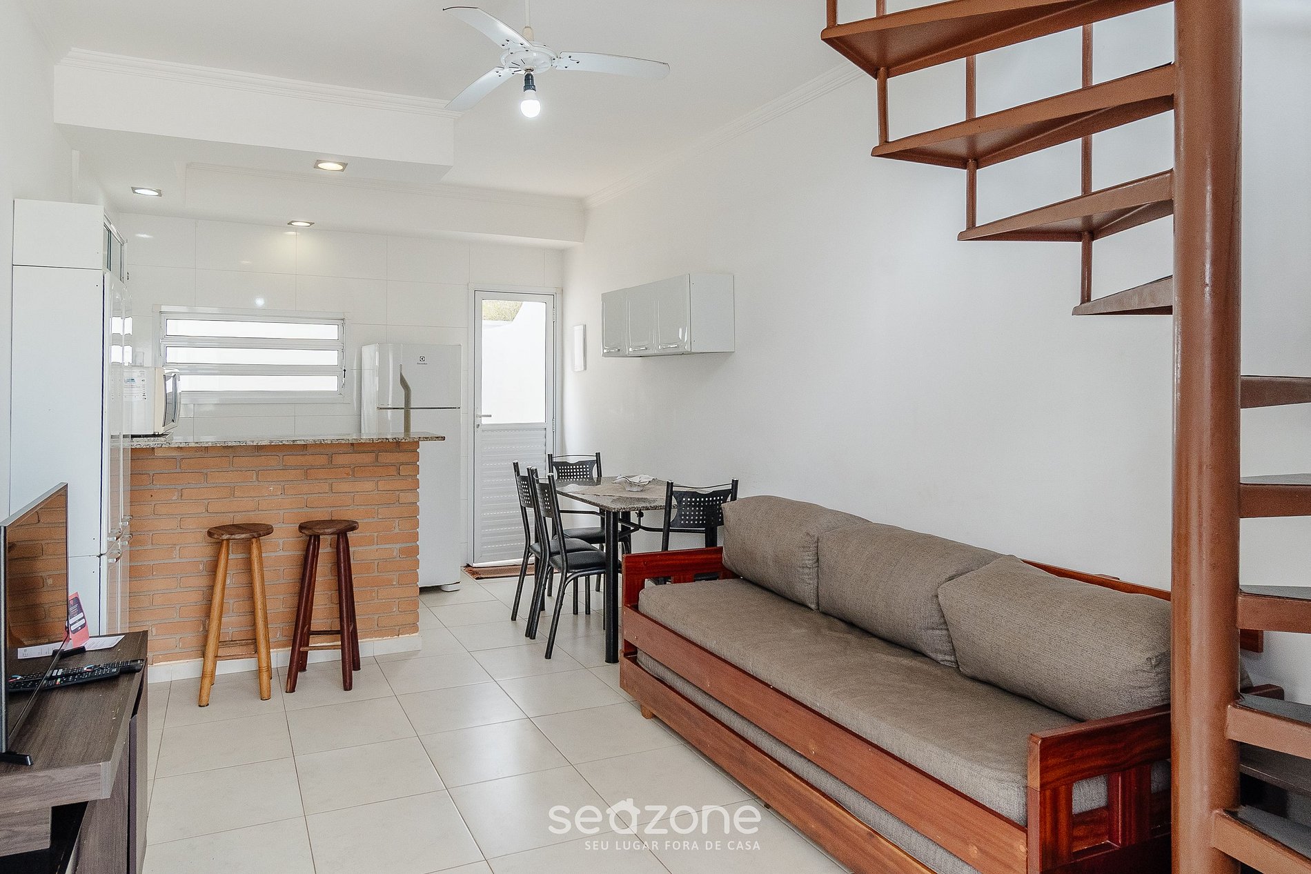 Este apartamento completo ofrece una suite en el altillo con una cama de matrimonio y una litera, una sala de estar con Smart TV y una cocina completa con utensilios esenciales. El balcón proporciona un espacio agradable para su comodidad. A solo unos pasos de la playa, tendrá lo mejor de Ubatuba a su alcance, con la conveniencia de tener restaurantes y mercados cerca.