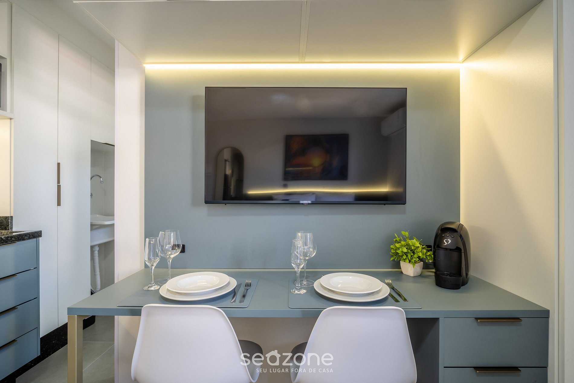 - Cocina completa con refrigerador, estufa cooktop, horno eléctrico, microondas, sandwichera, cafetera eléctrica, Kit de café (soporte para filtro, termo) hervidor eléctrico, licuadora, copas de vino, ollas, vajilla y utensilios;