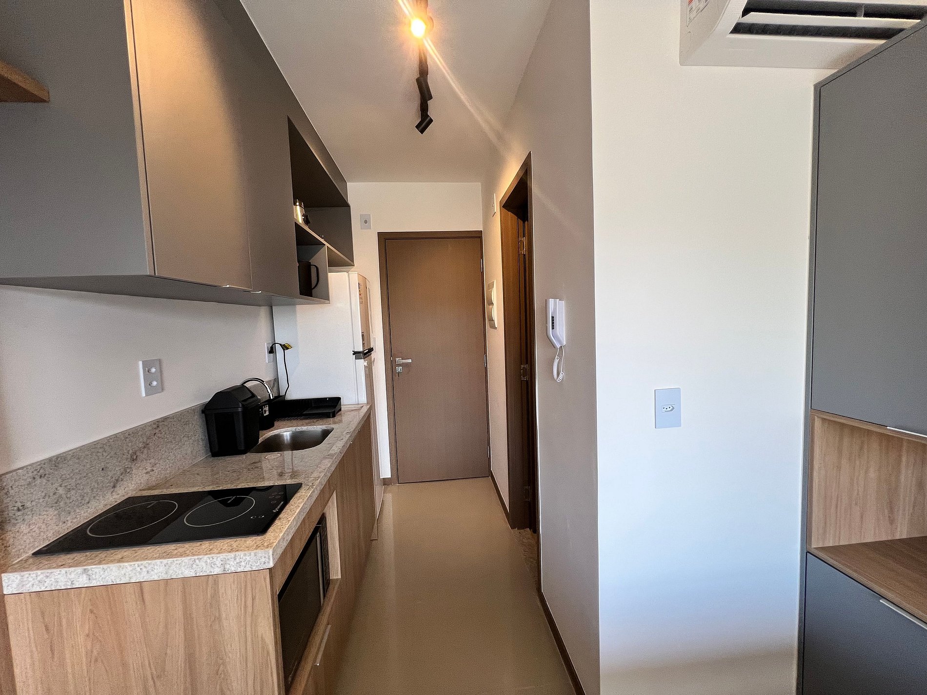 - Cocina totalmente equipada con refrigerador, placa de inducción, microondas, sandwichera, cafetera eléctrica, hervidor, licuadora, copas de vino, ollas, sartenes, platos y utensilios;