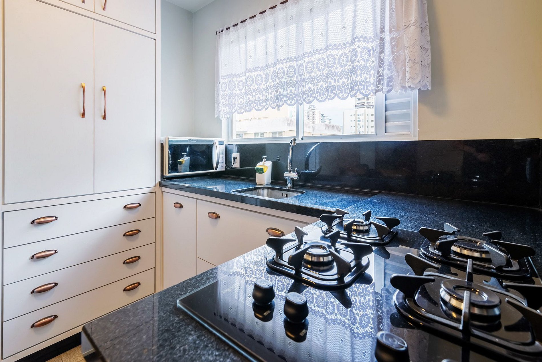 - cocina con estufa, nevera 'dúplex', microondas, hervidor eléctrico, cafetera, licuadora, sandwichera, ollas, vajilla y utensilios de cocina;