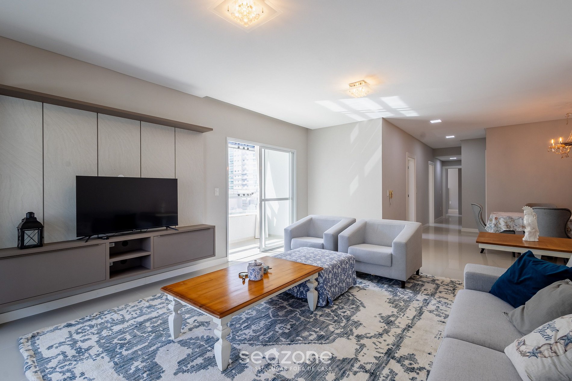 - Sala de estar con sofá, sillones y Smart TV;