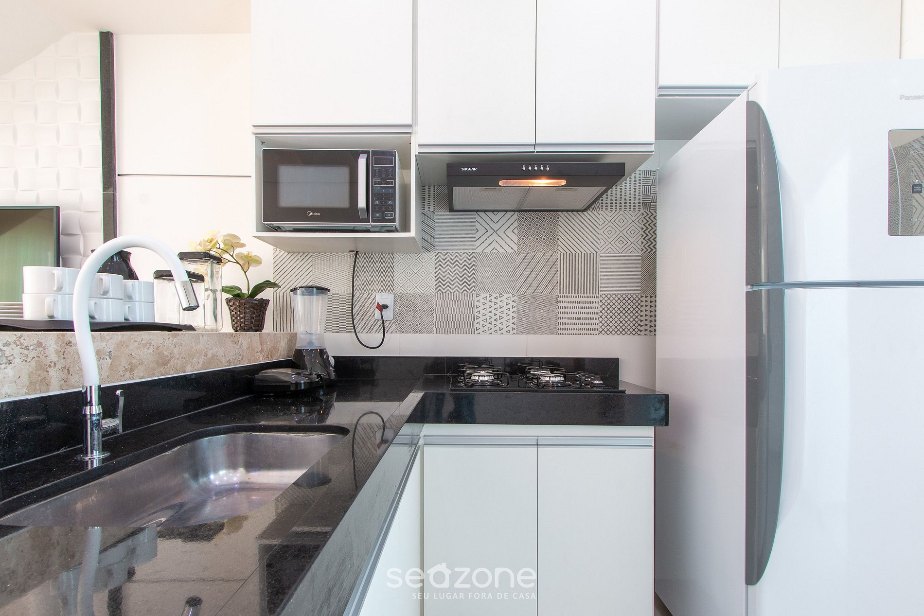 - Cocina con refrigerador, estufa cooktop, depurador de aire, microondas, freidora de aire de 12 litros, cafetera, tetera, sandwichera, licuadora, ollas, vajilla y utensilios;