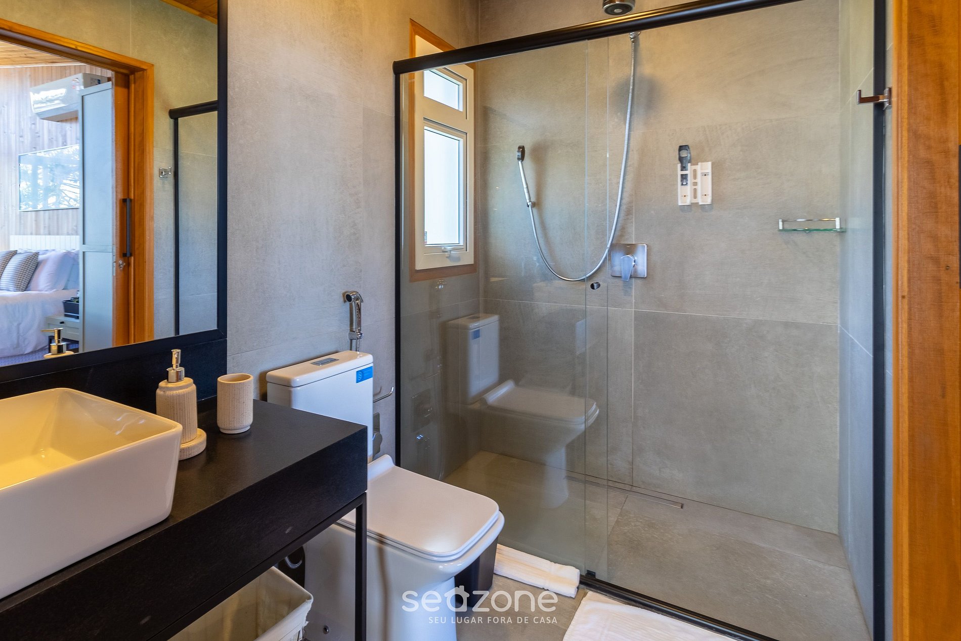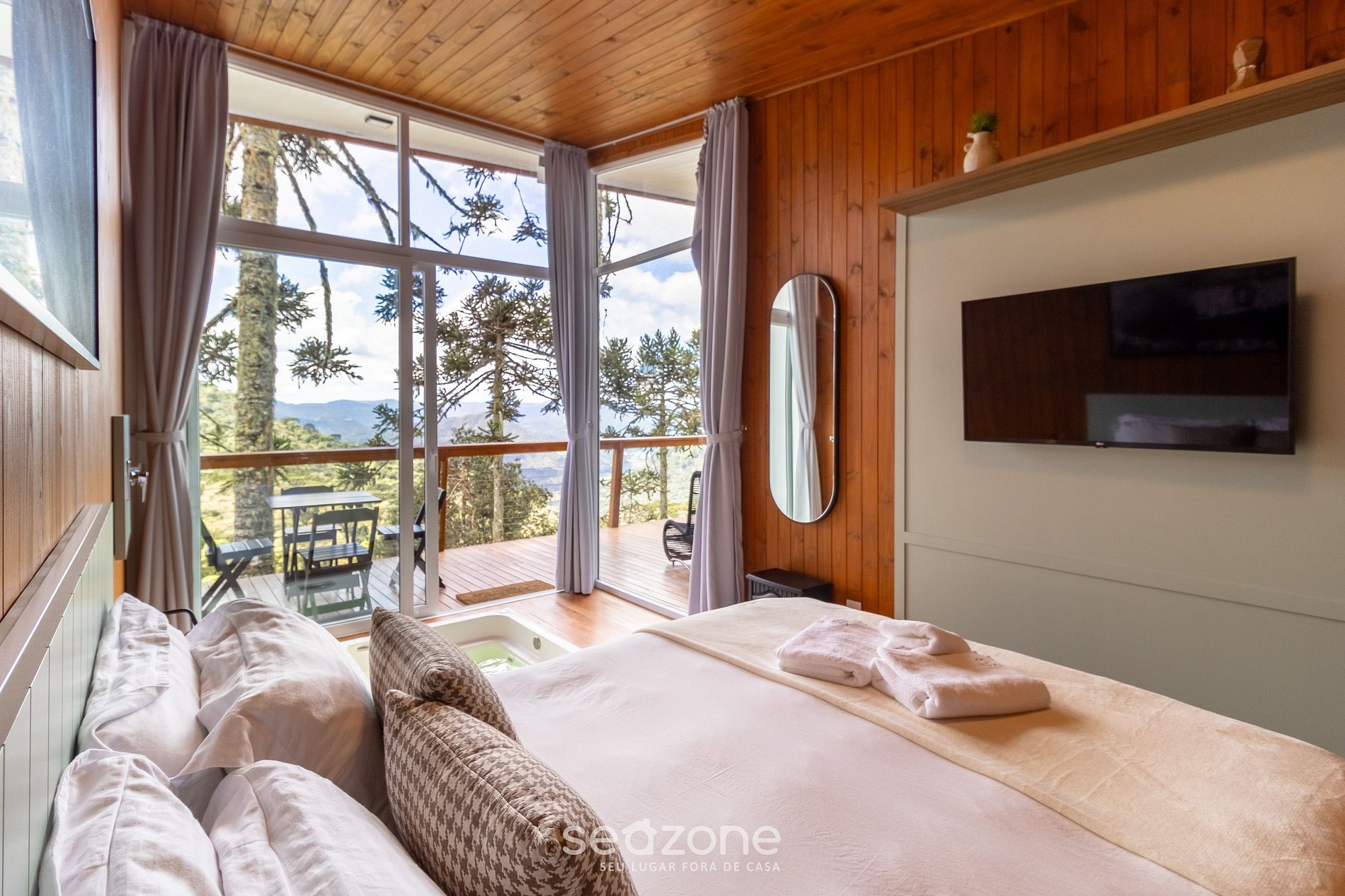 - 1 Suite con 1 cama queen size, Smart TV, closet y aire acondicionado; - Salón con sofá cama doble, Smart TV y aire acondicionado; - Cocina completa con heladera, anafe, horno eléctrico, microondas, sandwichera, cafetera, pava eléctrica, licuadora, sartenes, vajilla y utensilios; - Comedor con mesa y 4 sillas; - Balcón con vistas a las montañas y mobiliario exterior; - Ropa de cama y baño de calidad hotelera (la ropa de cama y las toallas adicionales corren a cargo de Seazone); - Wi-Fi disponible; - 2 plazas de aparcamiento exteriores (se trata de una plaza situada al lado de la cabaña, sin señalizar).