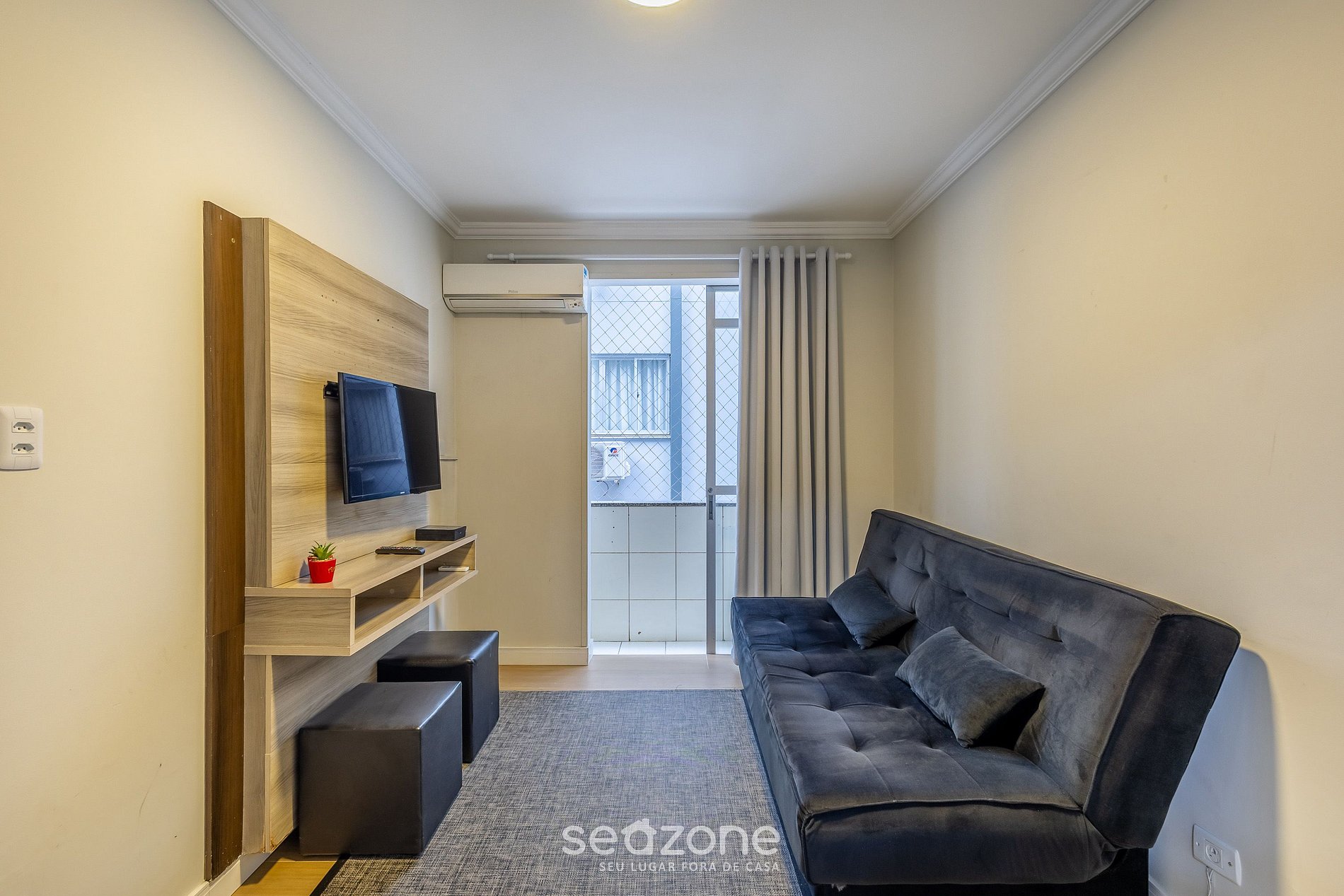 - Sala de estar con sofá, aire acondicionado y Smart TV;