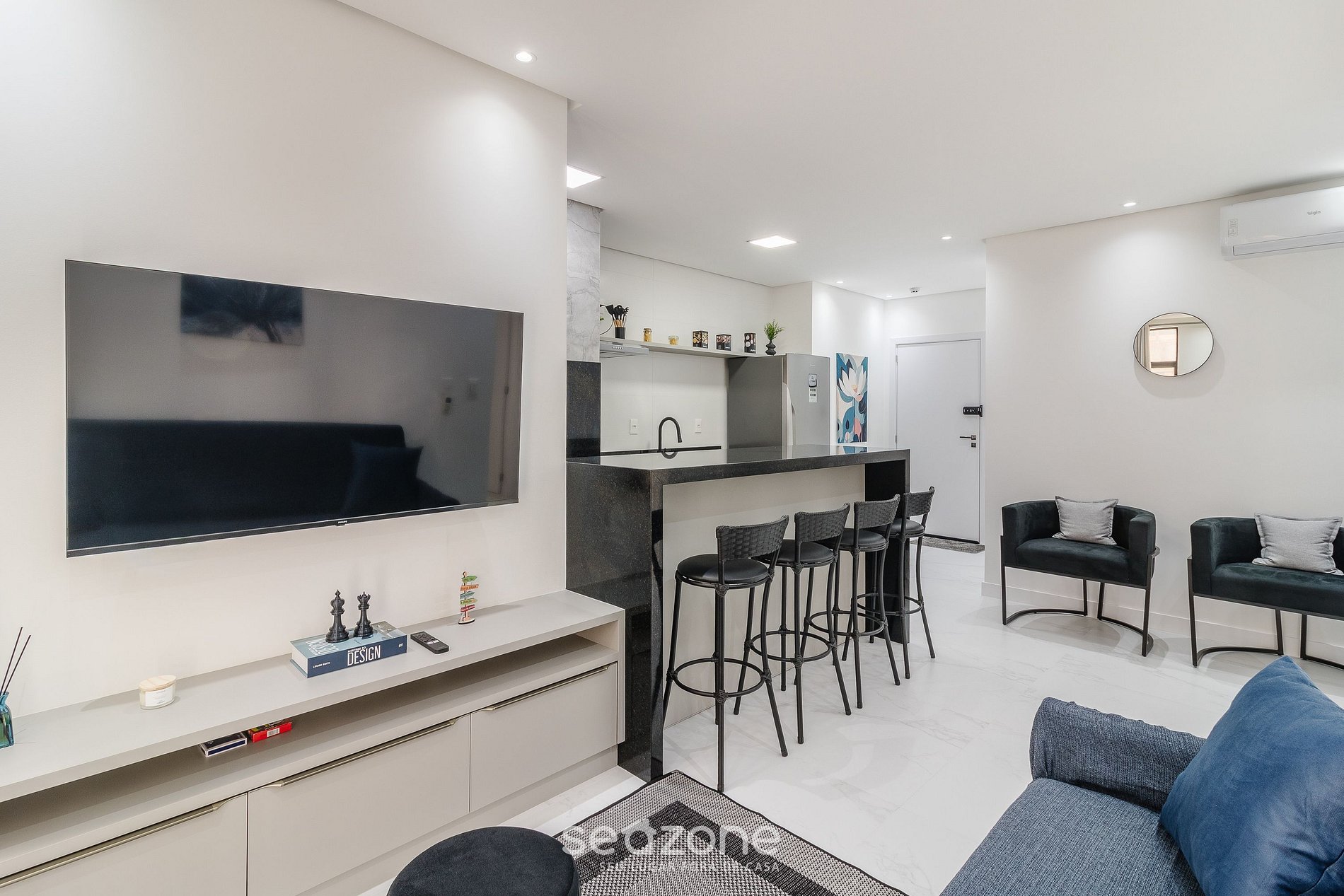 - Sala con sofá-cama doble, Smart TV y aire acondicionado;