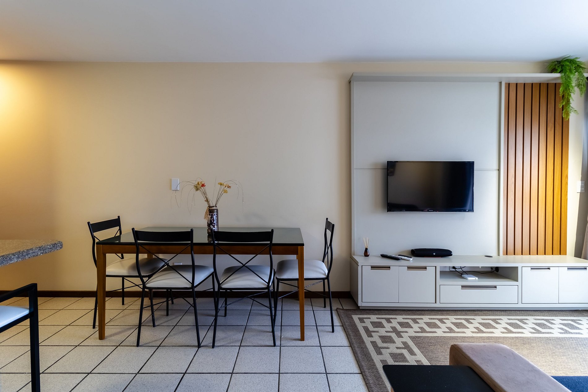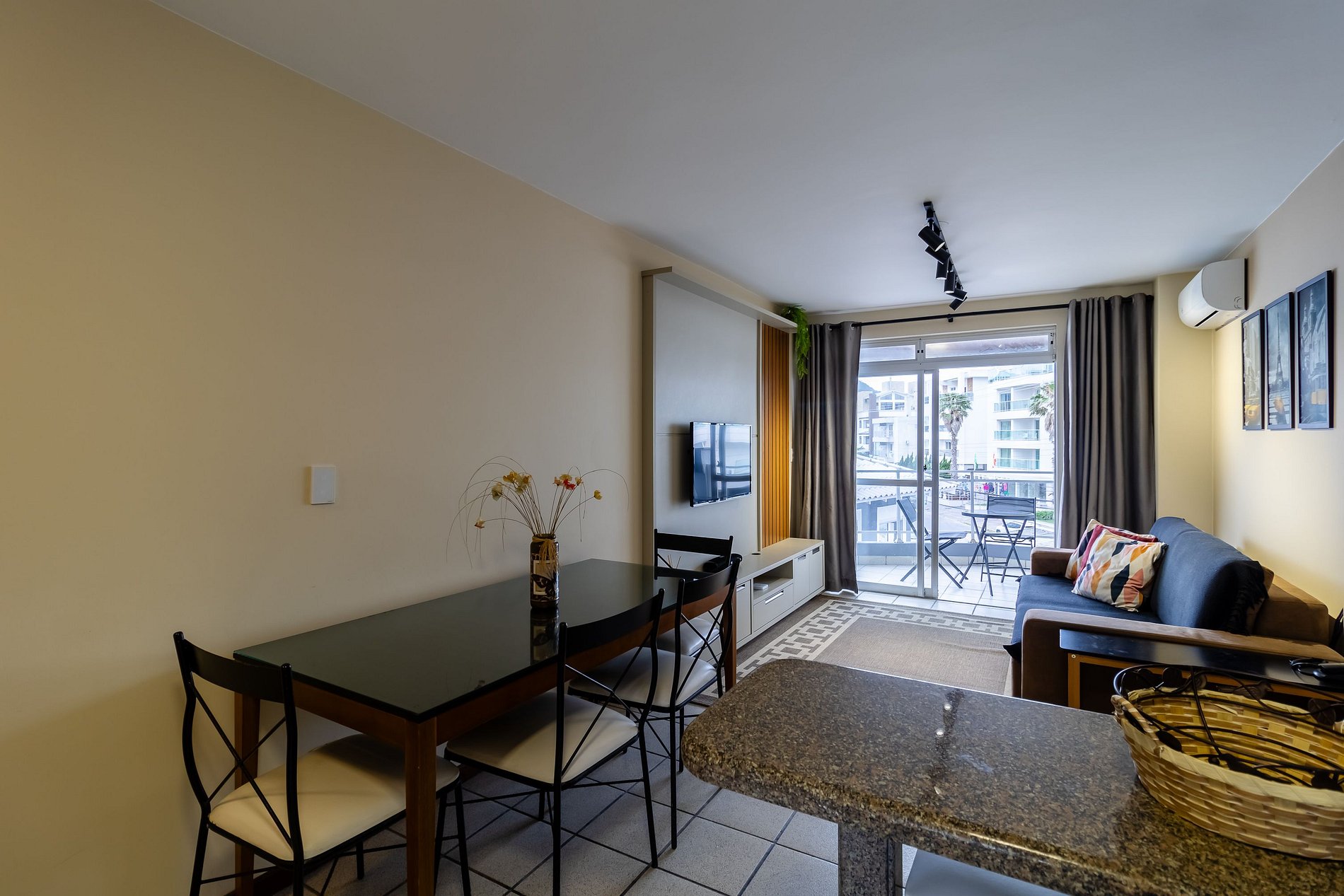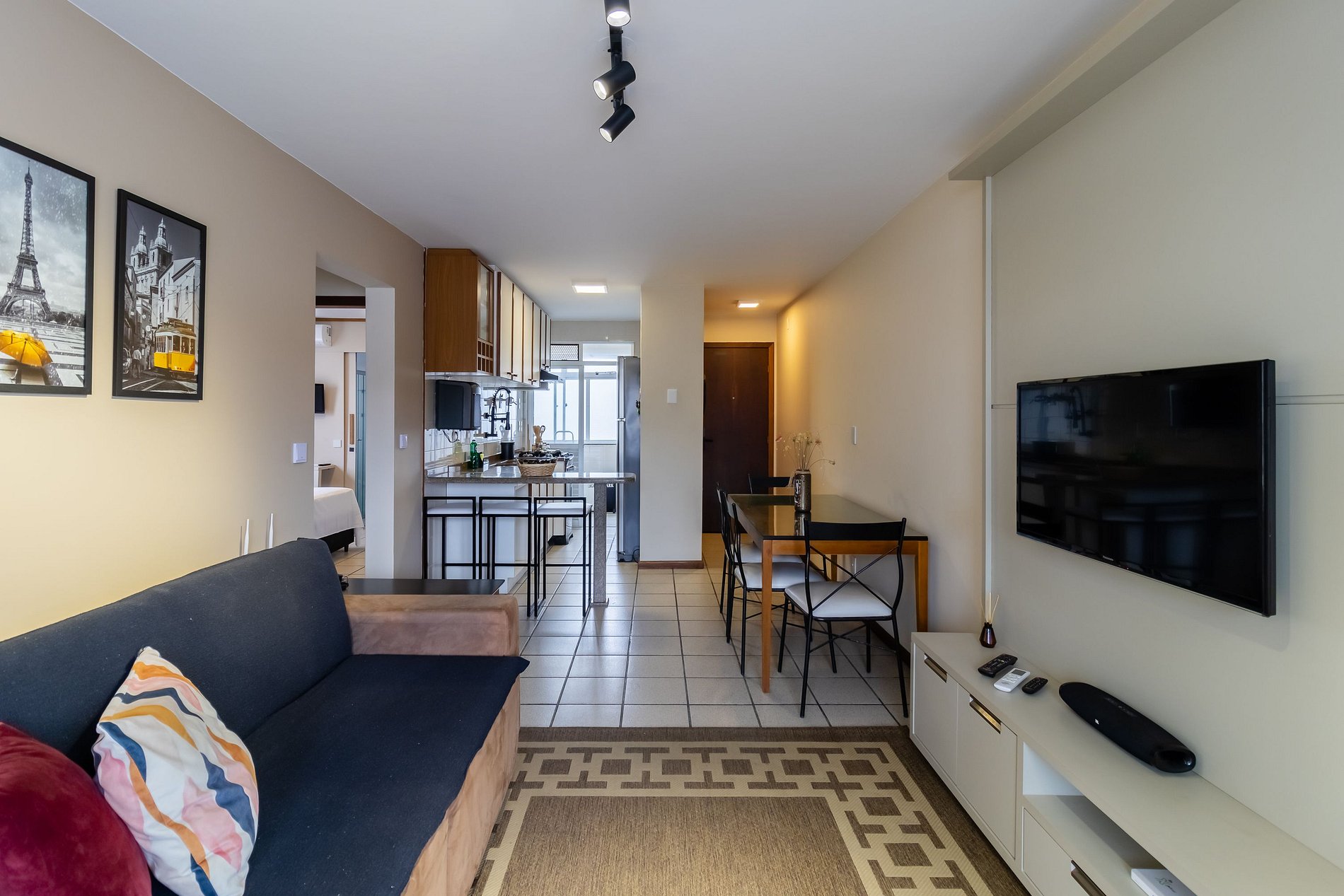 - Sala de estar com sofá, rack, TV e ar-condicionado;