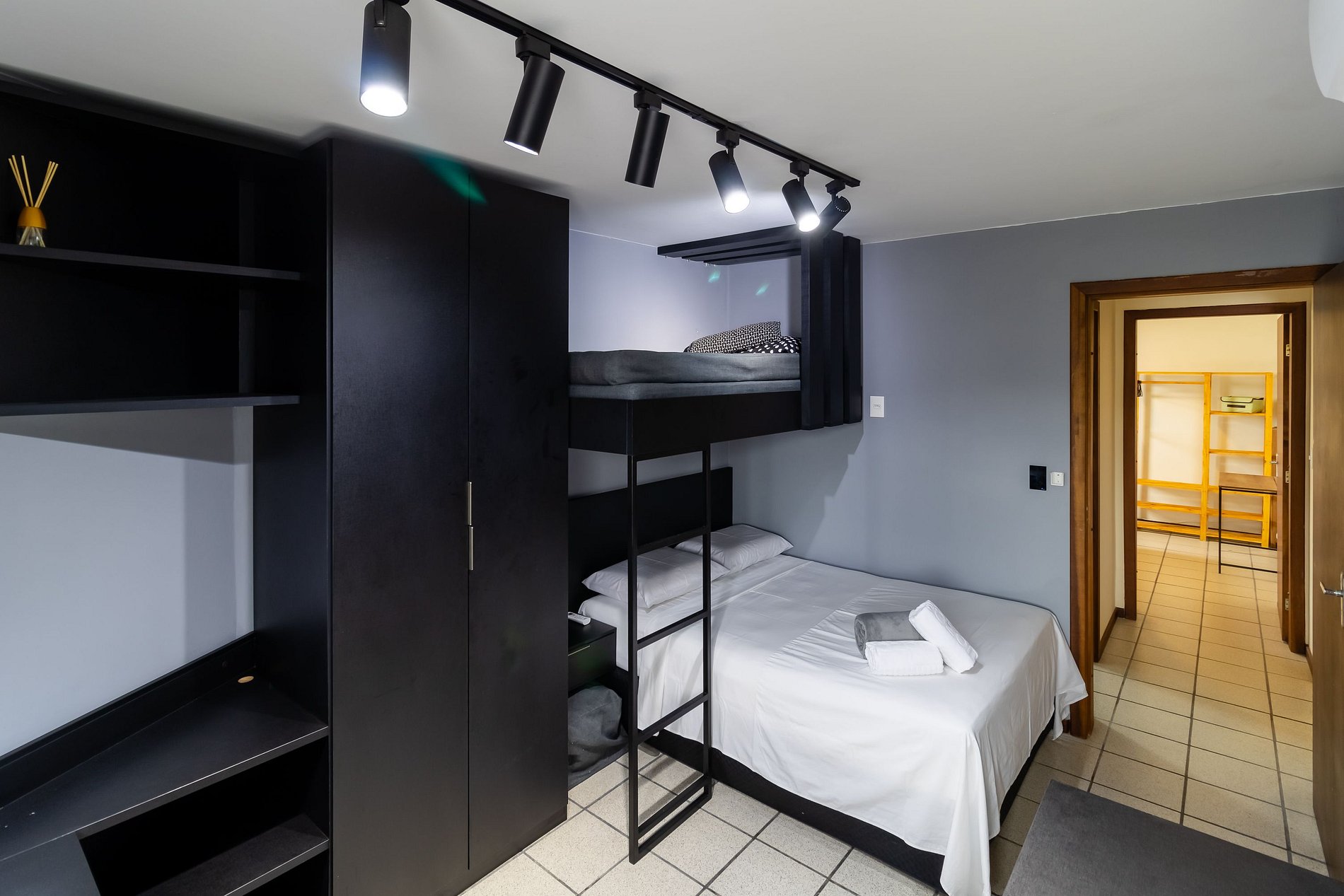 - 1 quarto com 1 cama de casal e uma cama de solteiro, bancada para trabalho, armários e ar-condicionado