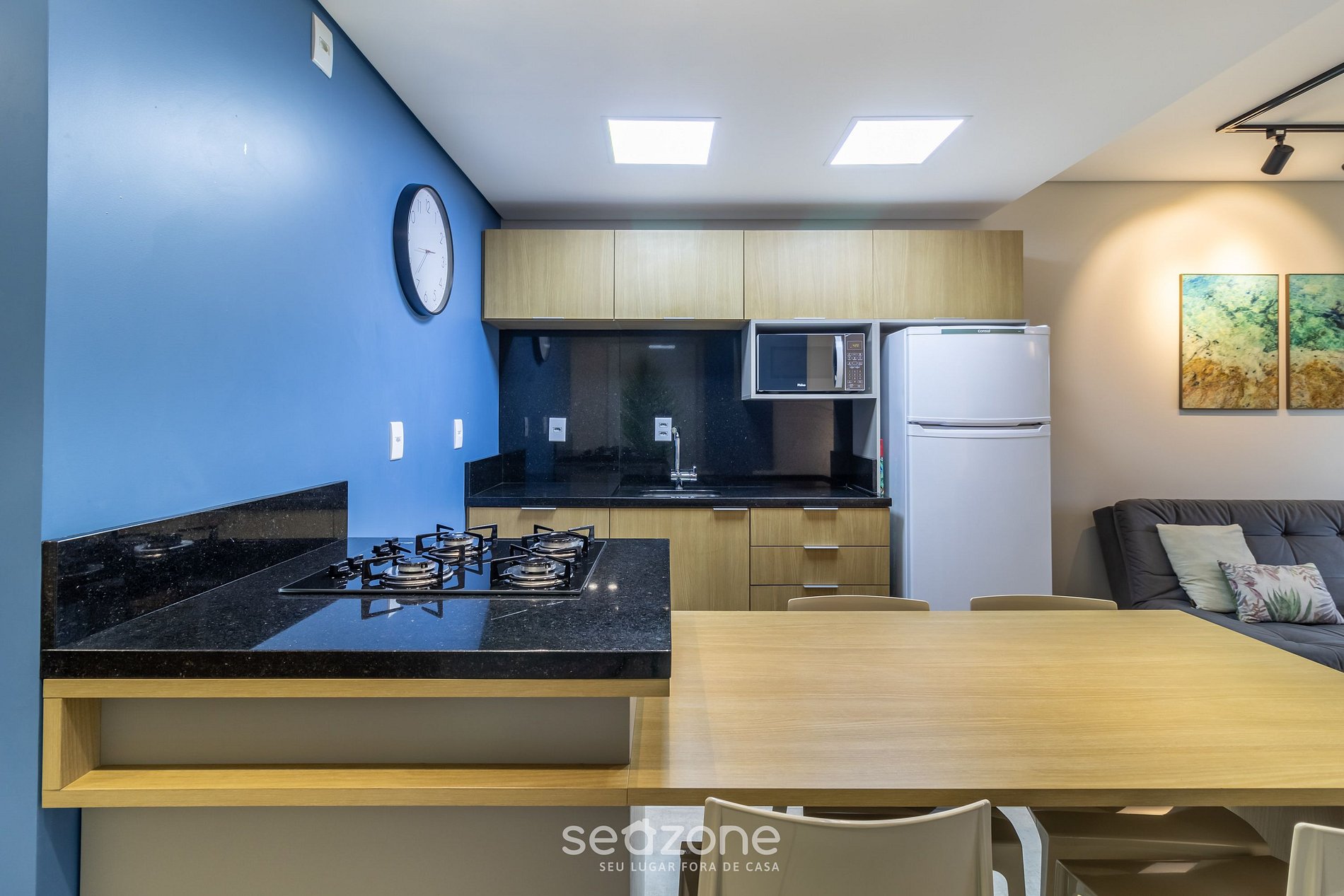 - Cozinha compacta com geladeira, fogão cooktop, micro-ondas, sanduicheira, cafeteira elétrica, chaleira elétrica, liquidificador, panelas, louças e utensílios;