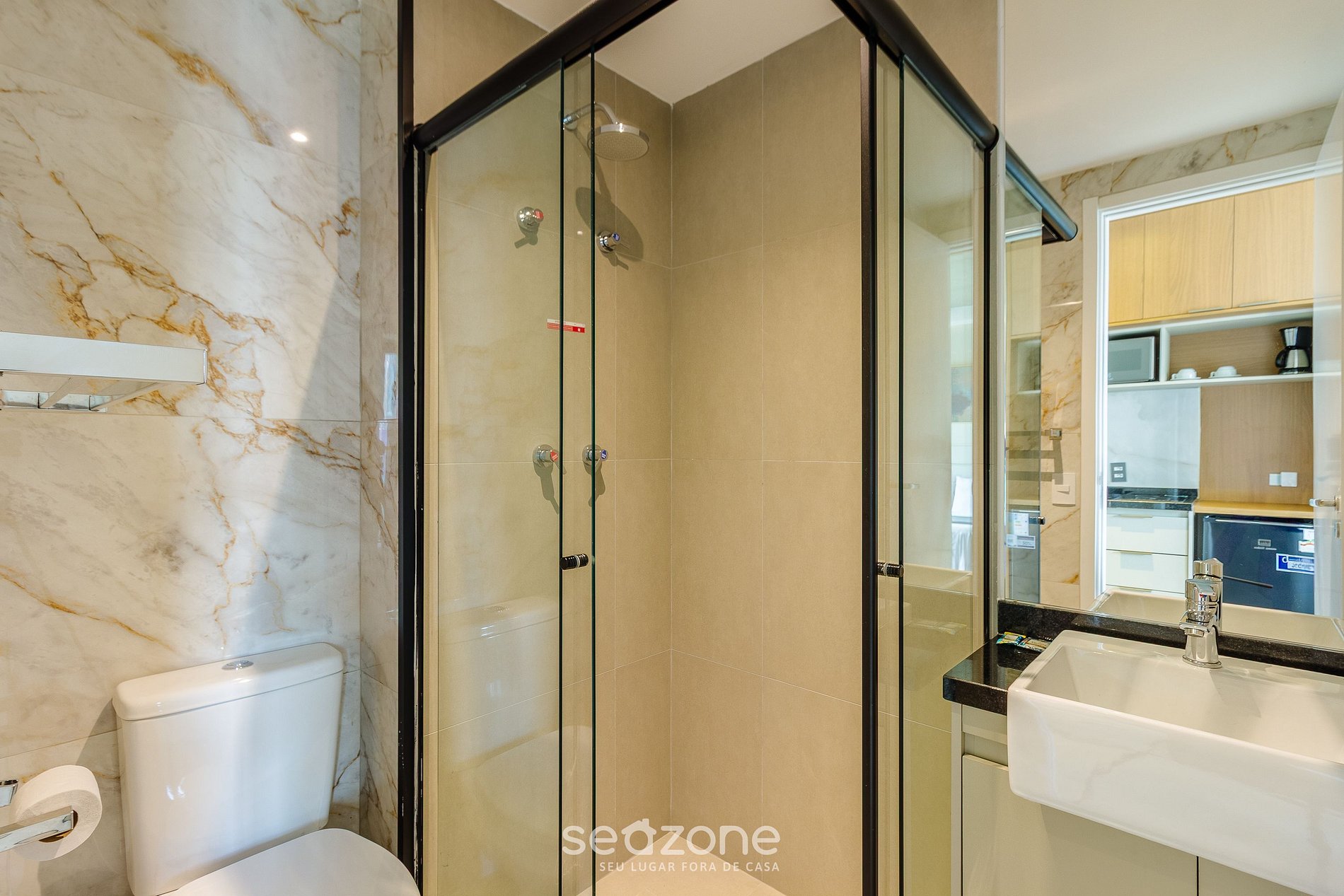 Para a sua comodidade, nosso condomínio oferece uma infraestrutura completa: piscina, academia para manter a sua rotina de exercícios, um mini mercado para suas necessidades diárias e a praticidade do self check-in para uma chegada tranquila e sem complicações.