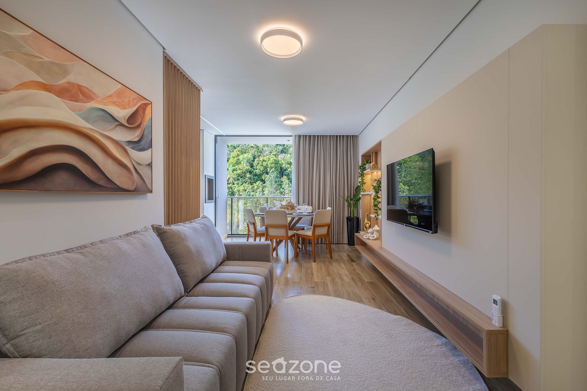 - Sala de estar com sofá, smart TV e ar-condicionado;