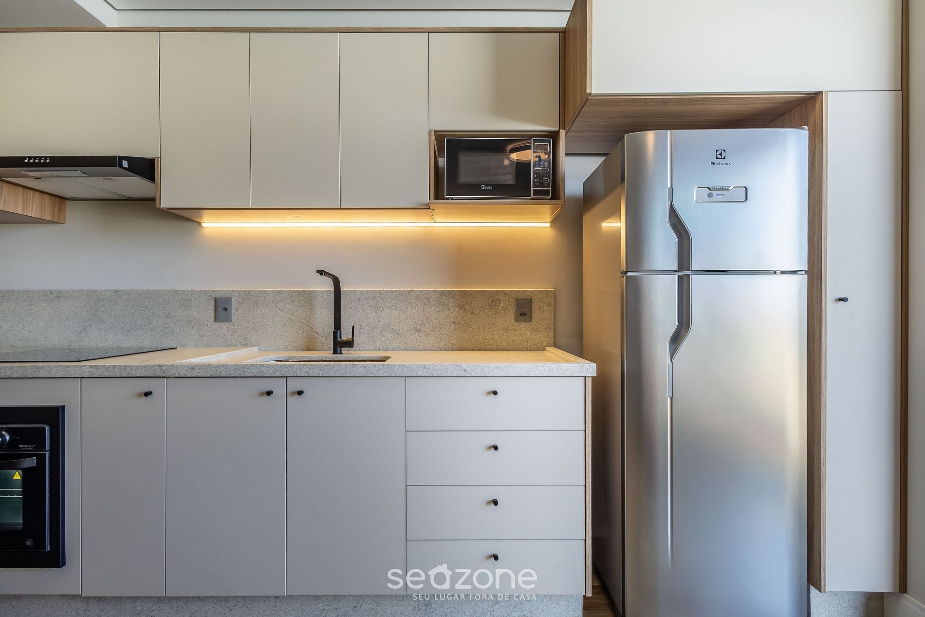 - Cozinha completa com geladeira, fogão cooktop (indução), forno elétrico, micro-ondas, sanduicheira, cafeteira elétrica, chaleira elétrica, liquidificador, taça de vinho, panelas, louças e utensílios;
