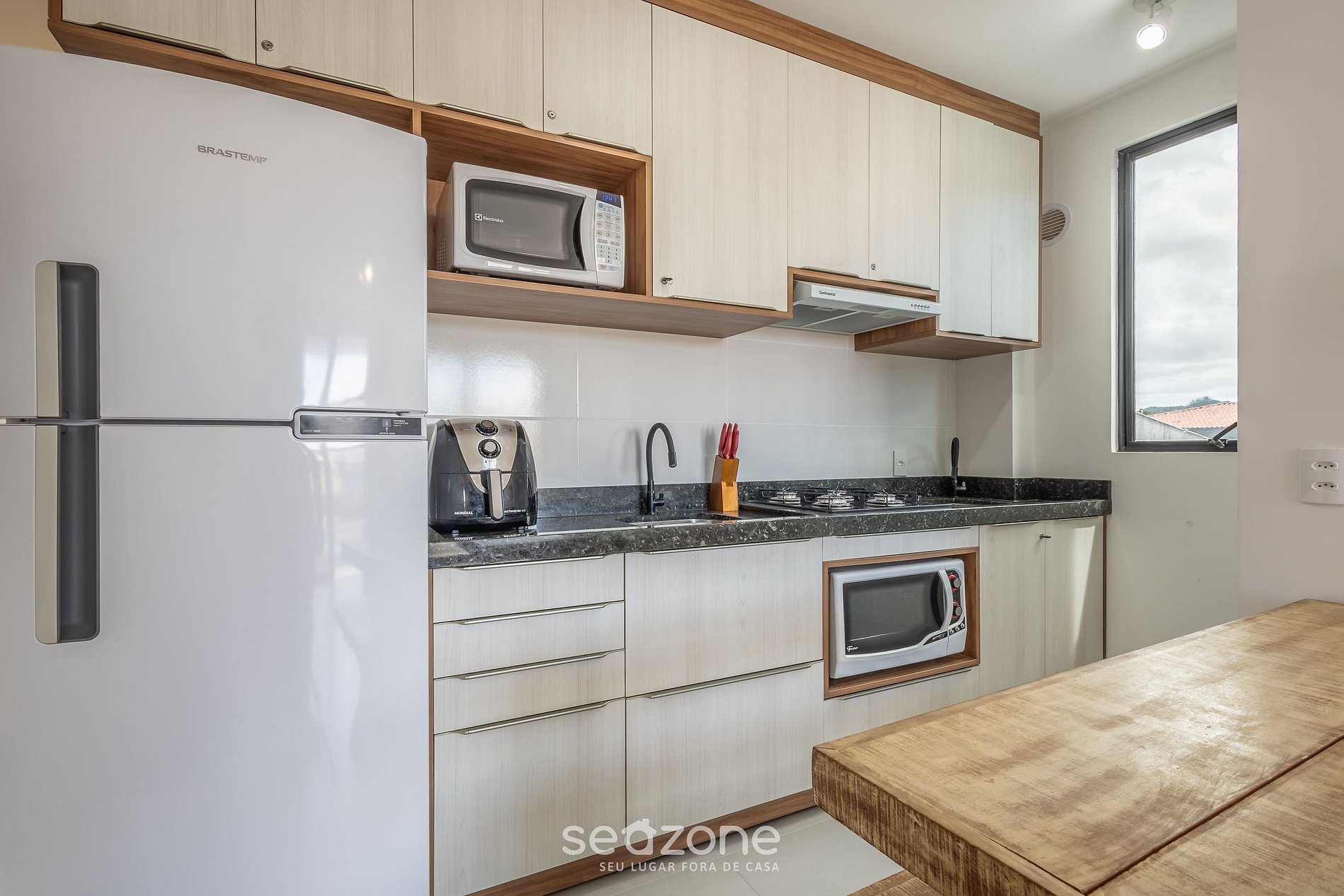 - Cozinha completa com geladeira, fogão cooktop (gás), forno elétrico, airfyer, micro-ondas, sanduicheira, cafeteira elétrica, chaleira elétrica, liquidificador, taças de vinho, panelas, louças e utensílios;